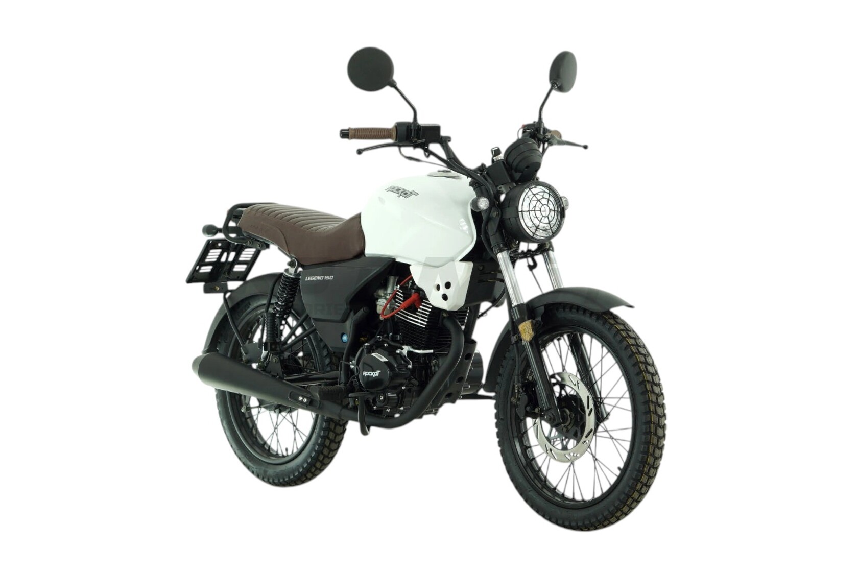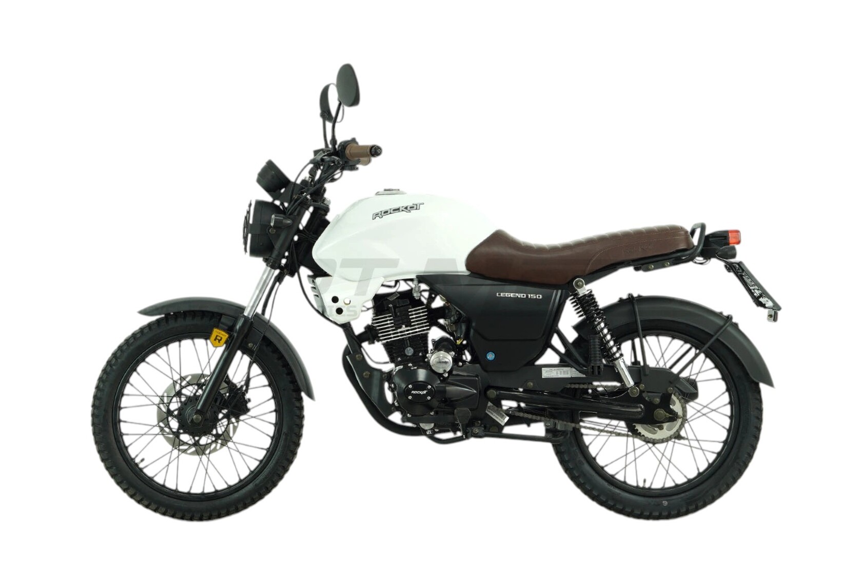 ROCKOT LEGEND 150 - классический дорожный мотоцикл, на создание которого команду специалистов Rockot-Motors вдохновили дорожные ретро-мотоциклы. В итоге, с конвейера завода сходят стильные, аутентичные, классические мотоциклы, которые отличаются от ретро-байков современными органами управления и оборудованием.При создании мотоцикла ROCKOT LEGEND 150, было взято множество образов мотоциклов по типам: классик, скремблер, каферейсер. Для придания модели духа мотоциклетной промышленности 70-х годов прошлого столетия, было решено установить металлические крылья спереди и сзади.Что, как не глушитель и его форма, может охарактеризовать стиль мотоцикла? Поэтому модель LEGEND 150 обрела фирменный глушитель, чья форма в простонародье называется “огурец”.Фара головного света имеет классическую круглую форму, а также специальную металлическую решетку “паутинку”, которая была так популярна раньше на мотоциклах класса типа скремблер.Сзади установлен округлый прямоугольный фонарь, выполненный в общей стилистике мотоцикла. Также, антуражность концепции мотоцикла достигается благодаря применению маленьких указателей поворотов круглой формы.Пожалуй, самое необычное решение, которое позволило показать, что это настоящий “железный” мотоцикл - обточенные, шлифованные ребра охлаждения на головке цилиндра. Современная LED приборная панель выполнена в круглом корпусе, что издали не отличает ее от привычного, классического спидометра.Мотоцикл ROCKOT LEGEND 150 выпускается в двух цветах: с белым глянцевым и черным матовым топливными баками. Но это не все их отличия. Модель белого цвета в своей комплектации имеет коричневое сиденье из эко кожи и коричневые ручки руля. Во второй расцветке мотоцикл выполнен полностью в черном цвете.LEGEND 150 оснащен ста пятидесяти кубовым четырехтактным двигателем CG150 производства Zongshen, который развивает мощность 11 лошадиных сил. Данная модель двигателя отлично зарекомендовала себя благодаря высокому уровню надежности, легкости в обслуживании и высоким показателям мощности и крутящего момента. Все это обусловлено конструкцией системы ГРМ с нижним распредвалом.Коробка передач - пятиступенчатая с многодисковым сцеплением мокрого типа. За образование топливной смеси отвечает карбюратор PZ27, который позволит добиться от двигателя максимальных мощностных характеристик и при этом останется экономичным. Как принято на мотоциклах типа “скремблер”, дорожный мотоцикл ROCKOT LEGEND 150 оснащается длинноходной подвеской. Спереди установлены классические амортизаторы длиной 700 мм и толщиной 31 мм. Сзади мотоцикл оборудован двумя пружинно-гидравлическими амортизаторами. Хоть мотоцикл и не развивает высокую максимальную скорость (до 110 км/ч), он оборудован дисковым гидравлическим тормозом спереди. И барабанным механическим тормозом сзади. Передний двухпоршневой тормозной суппорт работает в паре с 240 мм тормозным диском. Спереди и сзади установлены 18-ти дюймовые диски с универсальными покрышками размерностью 2.75-18 и 3.00-18. Прочные стальные спицевые диски окрашены в черный матовый цвет..