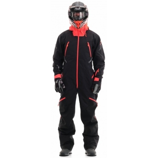Комбинезон предназначен для снегохода и сноубайка. Надежно защитит от ледяного ветра и мокрого снега. Ткань верха дополнительно содержит тефлоновое водоотталкивающее покрытие. Внешние молнии влагозащитные. Проклеены все швы. На рукавах есть эластичные манжеты, на штанинах снегозащитные юбки с петлёй для фиксации к ботинкам. При закрытой вентиляции и карманах комбинезон герметичен.Функционал комбинезона тщательно продуман и зарекомендовал себя среди снегоходчиков и сноубайкеров. Светоотражающие элементы есть со всех сторон. Семь карманов покрывают все потребности райдера, в том числе для ски-паса, телефона, и теплые, для согревания рук. Есть удобная петля под тангенту рации и кольцо D-ring для ключа горного снегохода. Центральная молнии с тремя замками: открывается сверху и снизу. Несъемный капюшон с двойной утяжкой. Для удобства приема пищи и воды во время стоянки – есть расширения на воротнике, защищает от ветра в расстёгнутом виде. В помещении можно снять верхнюю часть комбинезона и воспользоваться регулируемыми лямками - подтяжками..