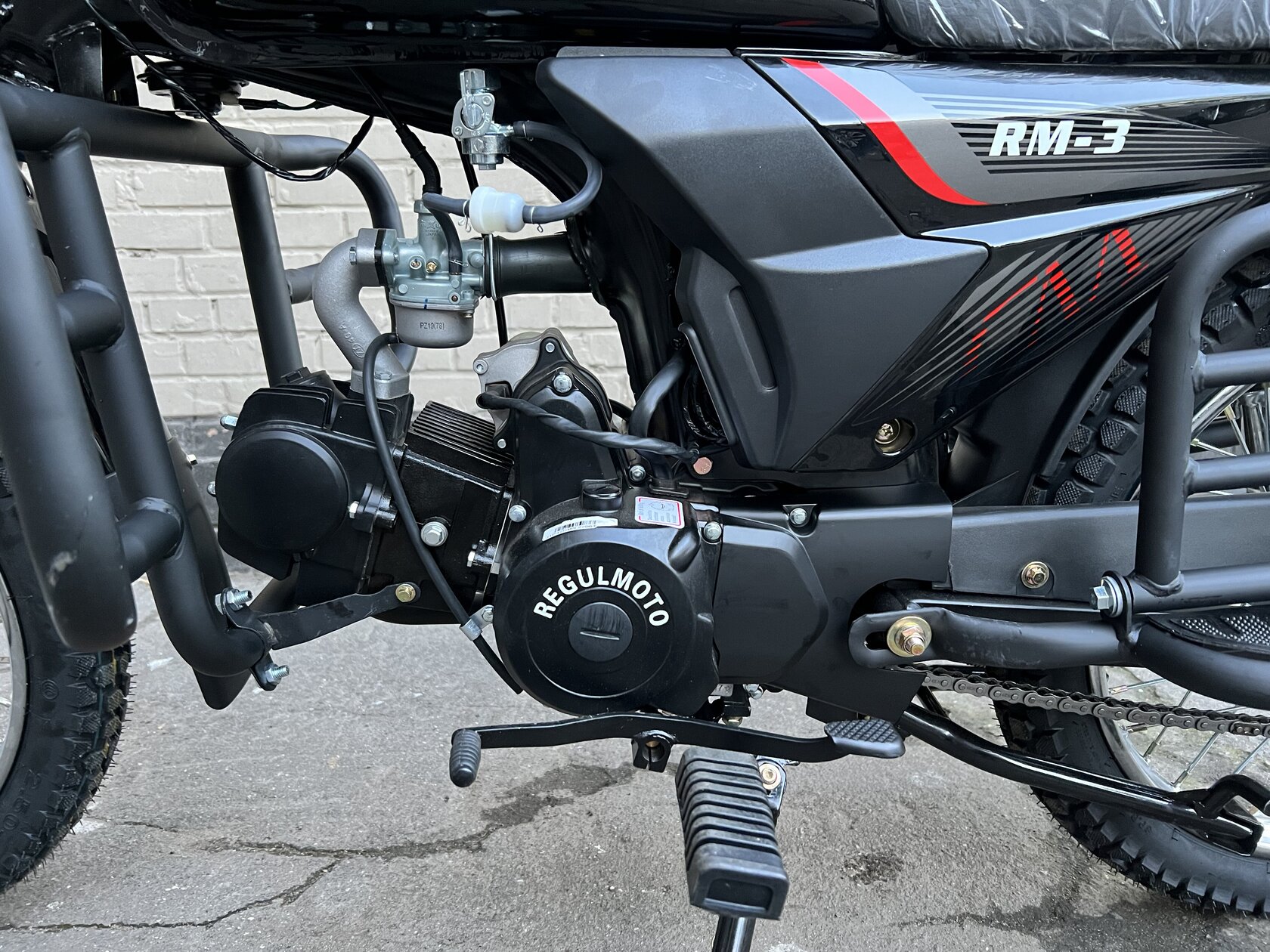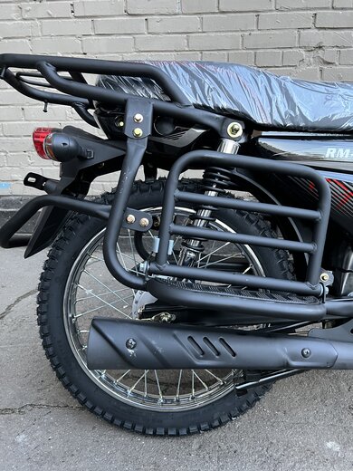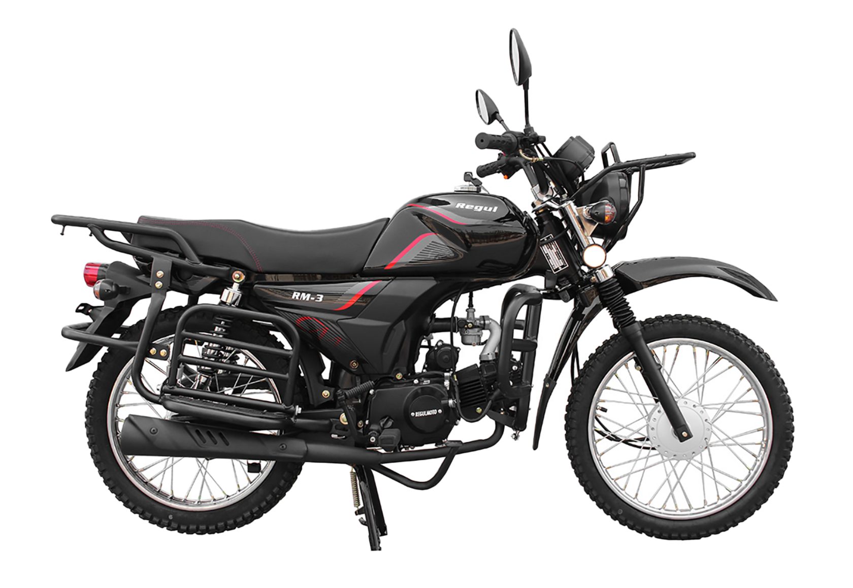 Комплектация Тормозная система – два барабанных тормоза. Усиленные тросы переднего тормоза и сцепления. Кроме того, на Regulmoto Alpha (RM-3) установлены зеркала заднего вида, подножки для пассажира, багажный кофр, пластиковые бардачки, кожух защиты цепи и дуги безопасности.