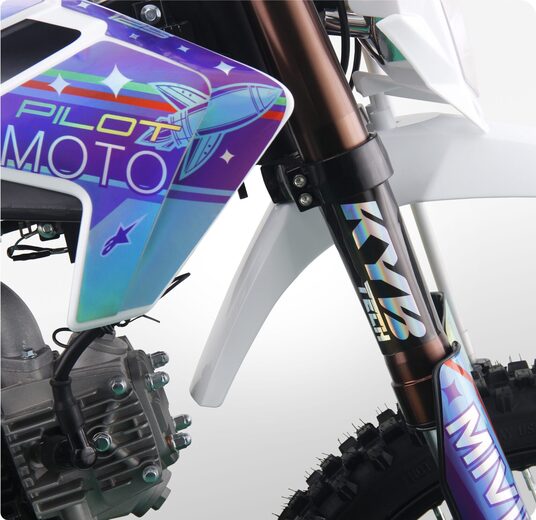 MIVIMOTO PILOT 125 — идеальный питбайк для новичков и молодых гонщиков. Легкий, компактный и надежный, он создан для тех, кто делает первые шаги на трассе и стремится развивать свои навыки. Модель сочетает в себе продуманный дизайн, простоту управления и уверенную динамику.- Четырехтактный одноцилиндровый двигатель объемом 125 см³ / 8 л.с. с воздушным охлаждением в сочетании с карбюратором Nibbi Racing PE17 обеспечивает эффективную подачу топлива и стабильную работу в любых условиях. Двигатель оснащен электростартером и полуавтоматической трансмиссией. Все это позволяет управлять техникой даже самым юным любителям мотоциклов.- Спереди питбайк оснащен перевернутой телескопической вилкой KYB tech, сзади — моноамортизатором с регулируемой жесткостью. Конфигурация обеспечивает плавный ход, хорошую отработку неровностей и комфорт при прыжках и резких маневрах.