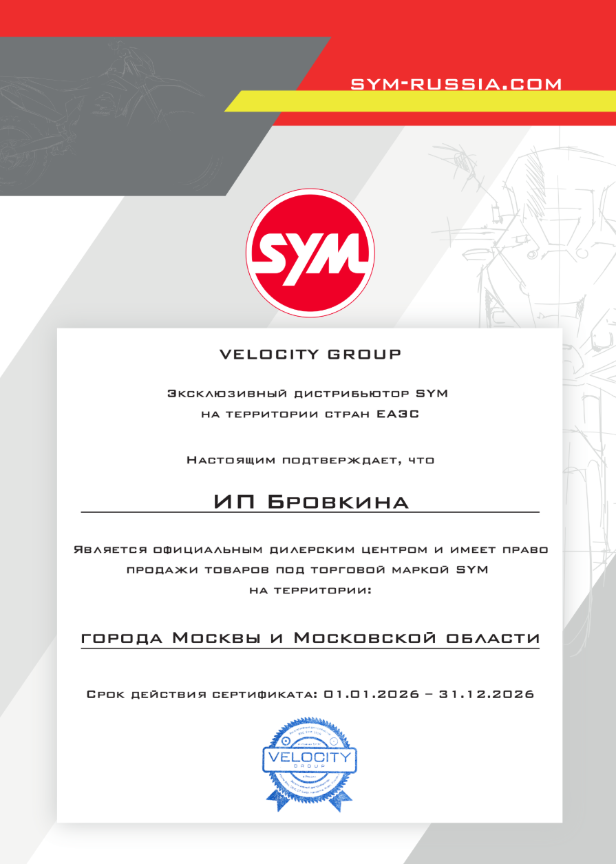 Мы являемся официальным дилером бренда SYM. Все единицы техники, представленные в нашем магазине, поставляются напрямую от производителя с полным комплектом документов.