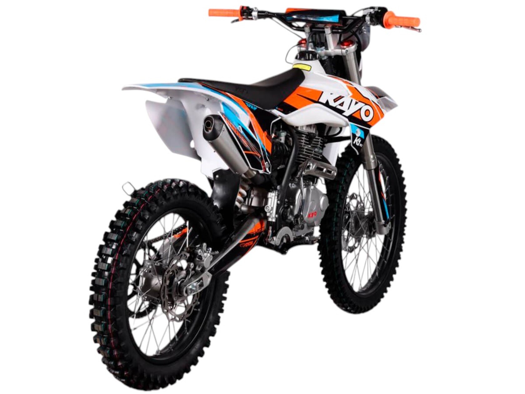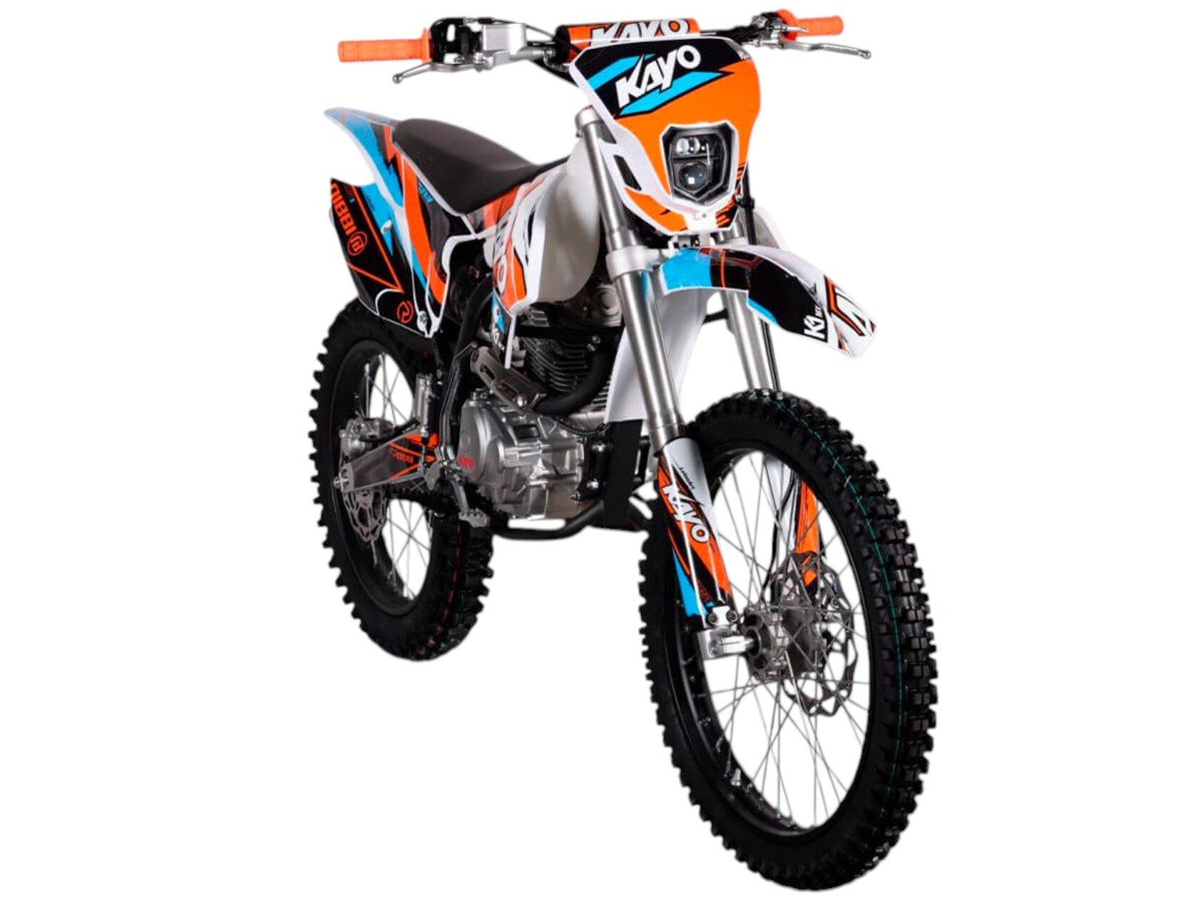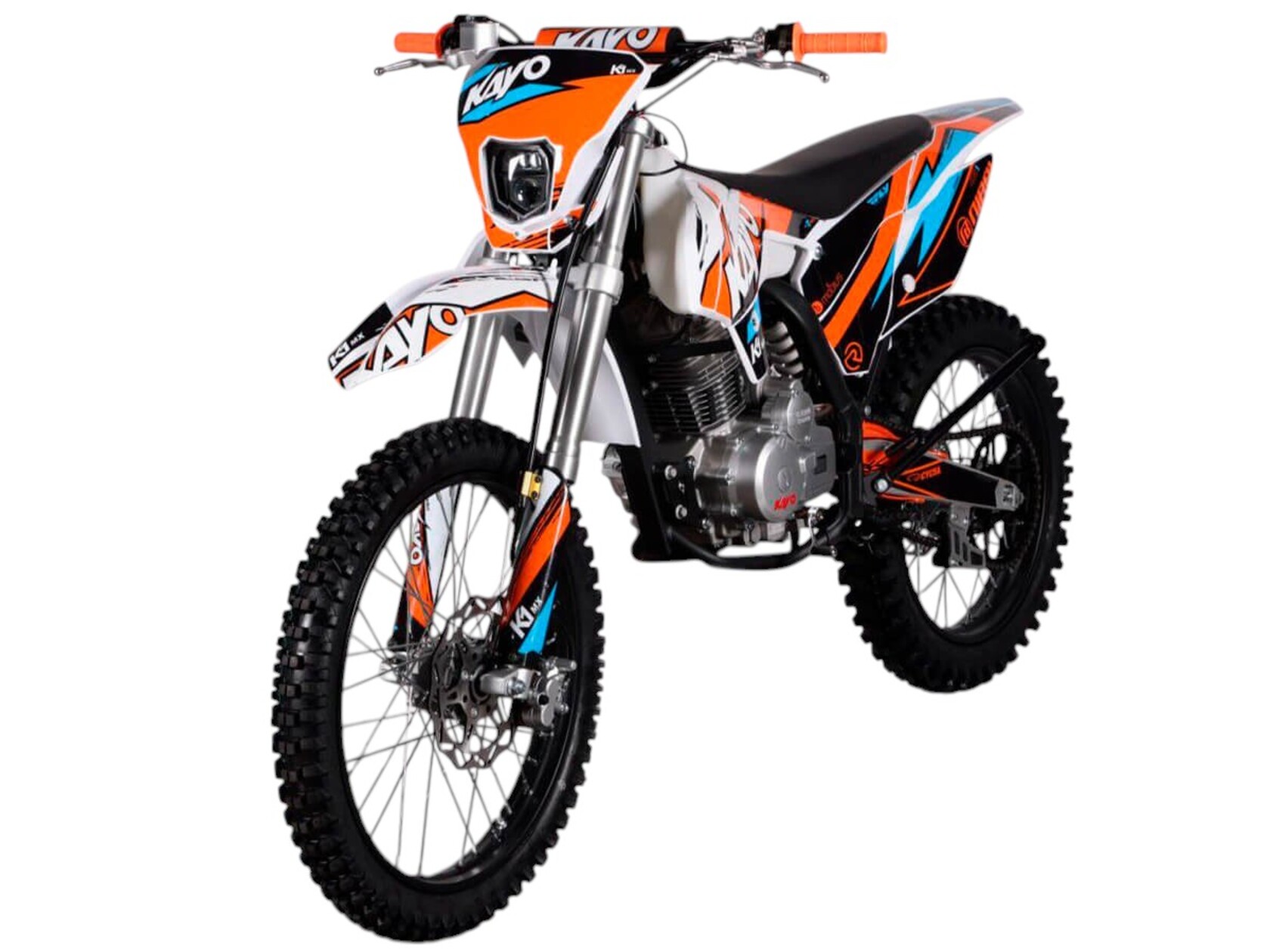 Мотоцикл KAYO K1-L 250 MX – “народная” версия внедорожного мотоцикла от компании KAYO 2024 модельного года. В его основе лежит проверенный временем двигатель, который обеспечил модели мировую популярность. Идеальный снаряд для внедорожного экстрима, представляющий собой оптимальный баланс производительности и технической оснащённости. Удобный, простой и надёжный мотоцикл, который полностью оправдывает свою цену.Мотоцикл оснащён одноцилиндровым 4-тактным двигателем воздушного охлаждения YX166FMM объёмом 223 см3, который выдаёт 17 л.с., что позволяет развивать большую скорость и с лёгкостью преодолевать трассы со сложным рельефом. Карбюраторная система подачи топлива с карбюратором PZ27 обеспечивает бесперебойную работу техники в самых жёстких условиях эксплуатации, простоту и лёгкость в обслуживании, а также неприхотливость к качеству топлива. Аппарат оснащён 5-ступенчатой механической коробкой передач с классической схемой “1-N-2-3-4-5”.Компания KAYO самостоятельно разработала раму и пластик на данном мотоцикле.Передняя подвеска – телескопическая регулируемая вилка перевёрнутого типа длиной 800 мм, задняя — нерегулируемый моноамортизатор длиной 360 мм, рассчитанный на высокие нагрузки до 900 LBS. Мотоцикл оснащён классическими спицованными колёсами диаметром 18 и 21 дюйм с прочными стальными ободами. Эффективное и безопасное замедление с любых скоростей обеспечивают гидравлические дисковые тормоза.Мотоцикл достаточно компактен и имеет вес всего 105 кг, поэтому он комфортен в эксплуатации одновременно и для мужчин среднего телосложения, и для девушек. Объём топливного бака составляет 6,7 л. Аппарат оснащён системой запуска двигателя при помощи кнопки электростартера или при помощи рычага кик-стартера.Высококачественная износостойкая резина с развитым протектором отлично держит дорогу на различных типах покрытия и в самых разных поворотах. Сиденье эргономичной формы покрыто антискользящим материалом. Яркая линзованная светодиодная фара позволяет кататься в тёмное время суток.K1 250 MX сочетает в себе отличные технические характеристики, комфорт и надёжность, что позволяет вам ощутить настоящую свободу на любой трассе.