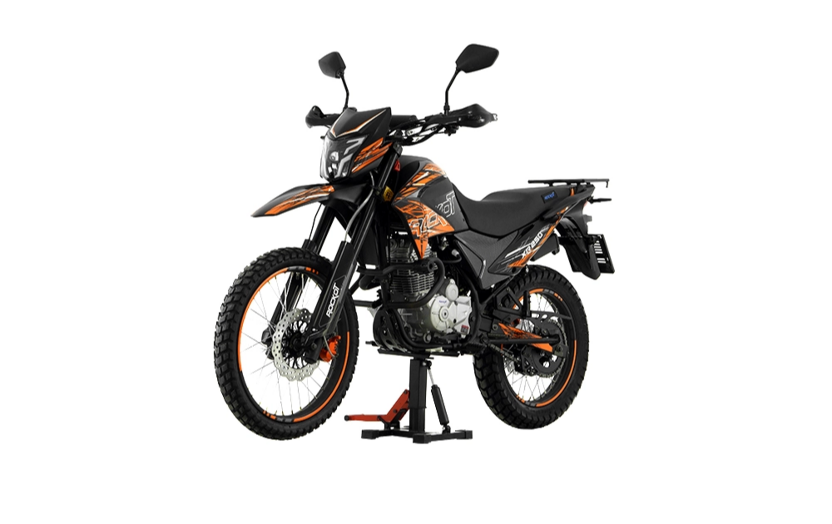 ROCKOT XR250 - новинка 2024 года в классе софт-эндуро. Мотоцикл имеет электронный ПТС и способен проехать везде, где пожелает его райдер. Колесная база 1380 мм и высота по седлу 850 мм обеспечивают потрясающую управляемость как на городских улицах, так и на бездорожье. ROCKOT XR250 - это современный софт-эндуро мотоцикл в ярком уникальном дизайне. На выбор предоставляются мотоциклы в трех вариантах расцветки: оранжевой, зеленой и красной.Назначение мотоцикла прямо указывает на наличие колес размерностью 21/18, широкое мягкое сиденье, вместительный топливный бак из металла, прочный эластичный облицовочный пластик и задний багажник, на который можно установить центральный кофр. Обода колесных дисков и тормозные суппорты имеют наклейки и окраску в один цвет с графикой мотоцикла. На руле установлена алюминиевая защита рук и рычагов. Цифровая приборная панель обеспечит водителю своевременный доступ ко всем необходимым данным во время поездки. Фара в современном дизайне с LED лампой ярко освещает дорогу в темное время суток и обеспечивает заметность мотоцикла в потоке в светлое время суток. Эндуро мотоцикл ROCKOT XR250 оснащается мощным, надежным и популярным двигателем ZONGSHEN (с 2023 года ZONSEN) PR250 172FMM с балансирным валом, мощность которого в пике достигает 21 лошадиную силу. Данный двигатель давно полюбился многим райдерам благодаря его надежности, простоте в обслуживании, высоким динамическим характеристикам, позволяющим преодолевать крутые подъемы и сложные препятствия. Важным преимуществом двигателя является наличие балансирного вала, устраняющего вибрации, исходящие от двигателя. Балансирный вал делает управление мотоциклом еще более комфортным. За образование топливовоздушной смеси отвечает производительный карбюратор NIBBI Racing PE28, отличающийся качественной работой, быстрым откликом на ручку газа и простотой в регулировке благодаря легкому доступу к регулировочным винтам. В основе мотоцикла стоит прочная стальная рама с “правильной” эндуро геометрией, обеспечивающей наилучшую управляемость на бездорожье и маневренность в городском потоке. В комплектацию мотоцикла также входят защитные дуги безопасности с крашпедами, позволяющие защитить райдера и облицовочный пластик мотоцикла.. Передняя и задняя подвески эндуро мотоцикла ROCKOT XR250 обеспечат высокую проходимость на бездорожье и комфортную езду с пассажиром. Спереди установлена телескопическая вилка перевернутого типа из двух амортизаторов, длиной 830 мм и толщиной рабочего штока 37 мм. Задняя подвеска состоит из стального маятника, моноамортизатора, длиной 400 мм, и прогрессивных рычагов, делающих работу подвески сбалансированной и равномерной. Эндуро мотоцикл ROCKOT XR250 оснащается гидравлическими дисковыми тормозами спереди и сзади. Передний тормоз состоит из 270 мм тормозного диска и двухпоршневого суппорта, а сзади диск, диаметром 240 мм, и однопоршневой суппорт. Все тормозные шланги армированные. Стандартно для эндуро мотоцикла, ROCKOT XR250 оснащается стальными колесными дисками, диаметром 21 и 18 дюймов, и универсальными вседорожными шинами. Размерность шин: 90/100-21 и 120/90-18. Такие шины способны обеспечивать хорошее сцепление с дорогой на асфальтовом покрытии и с грунтом на бездорожье.Привод осуществляется приводной цепью, шагом 520. Ведомая приводная звезда имеет 45 зубьев.