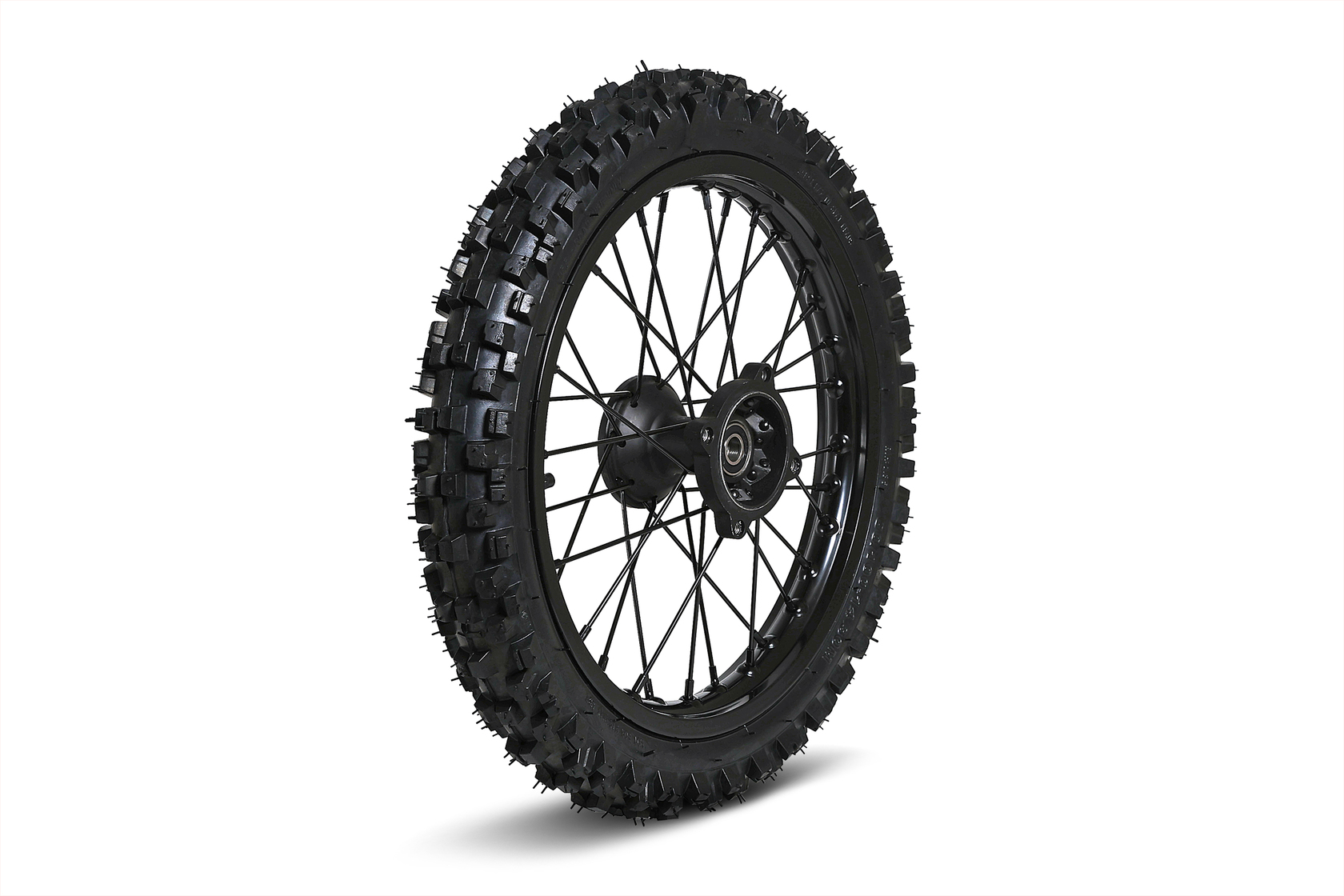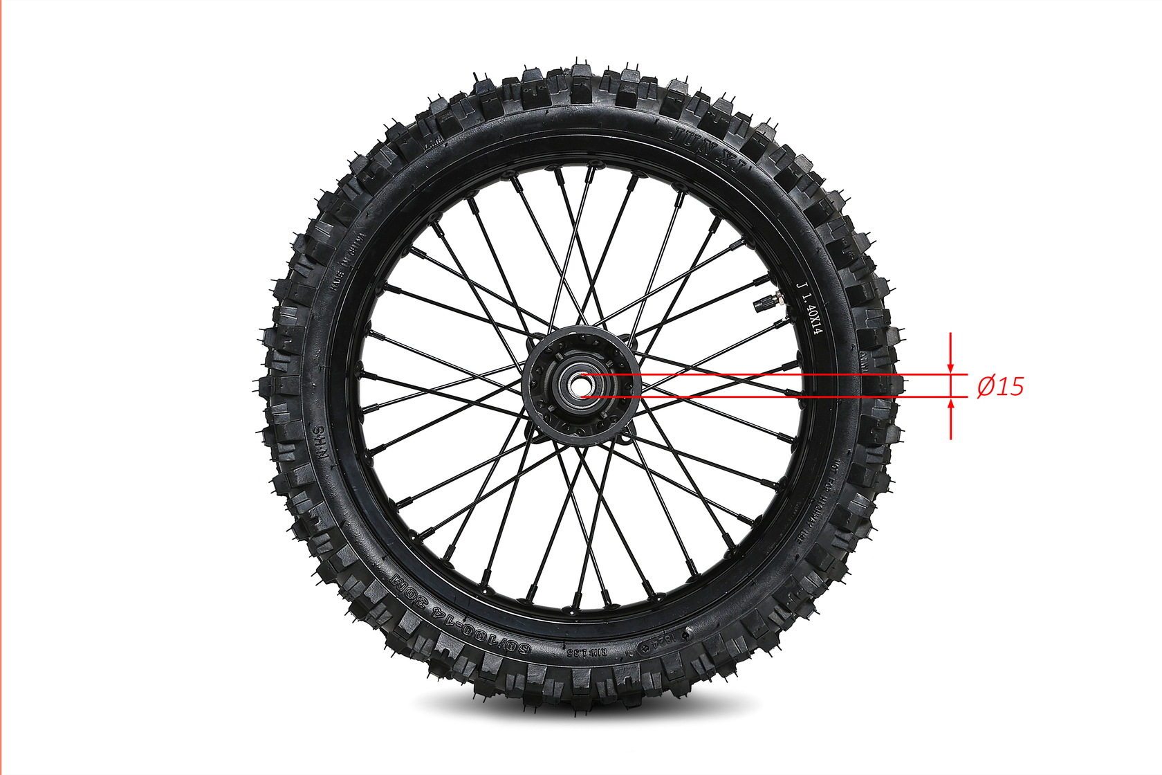 • Переднее колесо в полной комплектации с покрышкой. Алюминиевый обод черного цвета диаметром 14 дюймов. Посадочный диаметр под ось 15 мм. Поставляется без тормозного диска и без оси в комплекте.
