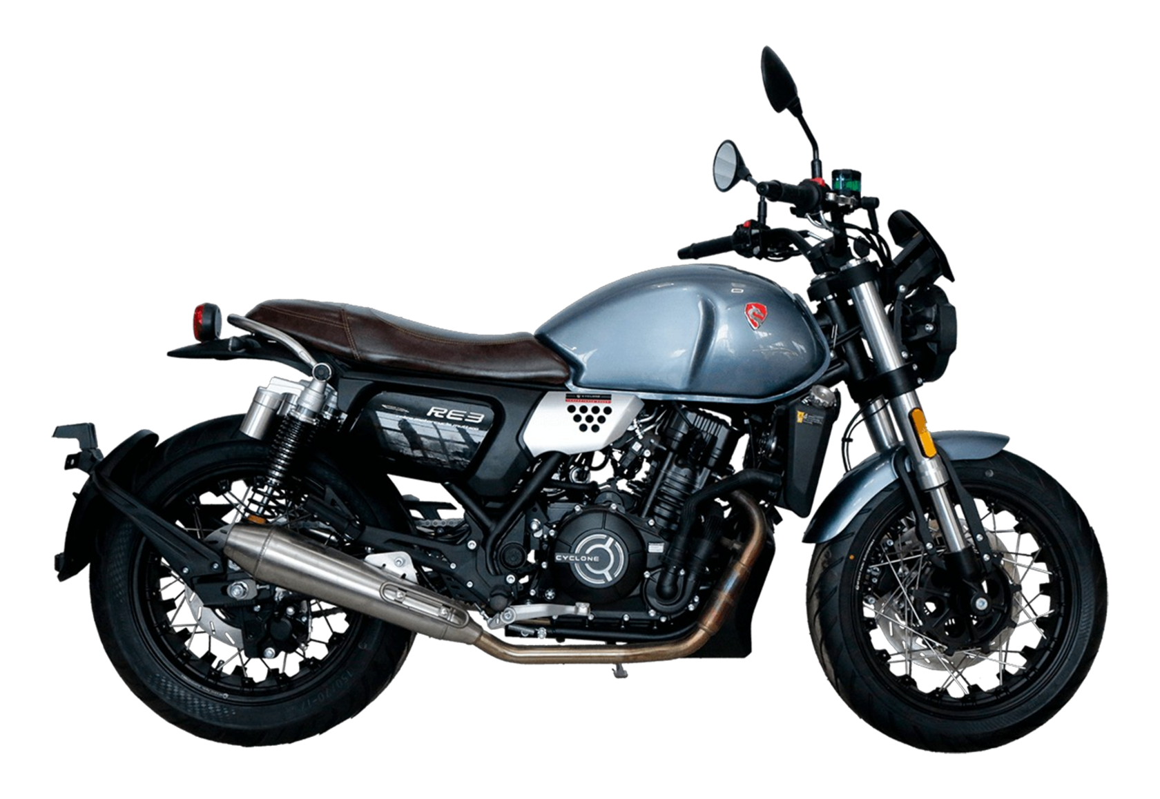 CYCLONE RE3 (SR400) – классик, в котором подчёркнутая простота объединяется с современными технологиями.Двухцилиндровый четырёхтактный двигатель объёмом 401 см3 выдаёт 43 л.с. на 9500 об/мин. Максимальный крутящий момент достигается на 8000 об/мин и составляет 34 Н·м. Инжекторный впрыск топлива с инжектором BOSCH увеличивает топливную экономичность, а также позволяет добиться высокой приёмистости и неприхотливости агрегата. Жидкостная система охлаждения не допустит перегрева двигателя даже при самом агрессивном вождении. На мотоцикл установлена 6-ступенчатая механическая коробка передач.Максимальная скорость мотоцикла составляет 140 км/ч.RE3 оснащён классическими спицованными колёсами диаметром 17 дюймов. Колёса обуты в бескамерные покрышки TIMSUN. С неровностями дороги эффективно справляются регулируемая телескопическая вилка перевёрнутого типа спереди и маятник с двумя амортизаторами сзади. Ход передней подвески составляет 110 мм, задней – 81 мм. Эффективное и безопасное замедление с любых скоростей обеспечивают гидравлические дисковые тормоза с ABS спереди и сзади.Клиренс мотоцикла составляет 145 мм. Объём топливного бака – 19 л. Снаряжённая масса – 186 кг.Из дополнительного оборудования можно выделить USB-порт, подсветку пультов и датчики давления в шинах.Мотоцикл сочетает в себе отличные технические характеристики, комфорт и надёжность, что позволяет вам ощутить настоящую свободу на любой дороге.
