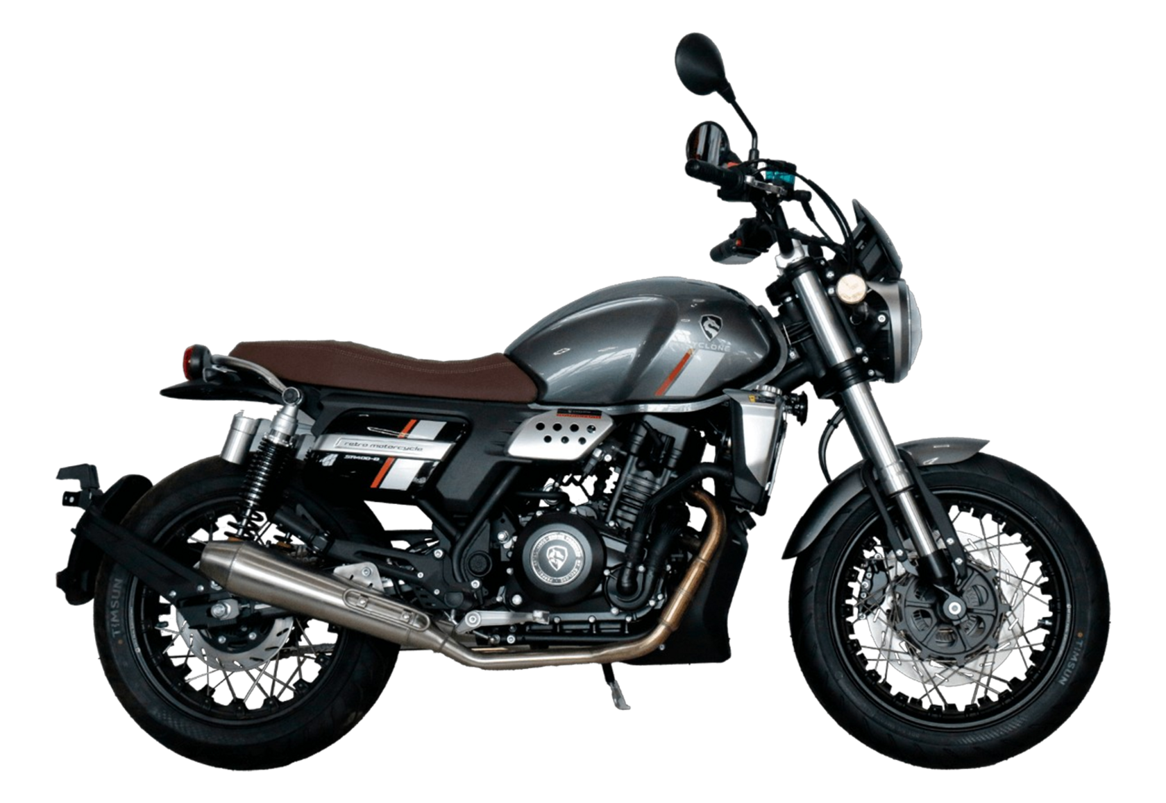 CYCLONE RE401 (SR400-B) 2024 – классик, в котором подчёркнутая простота объединяется с современными технологиями. Данная модель является более продвинутой версией модели RE3 (SR-400) – мотоцикл обладает более современным дизайном, снабжён стильными металлическими накладками на радиатор, а также топливным баком, объём которого увеличен до 20 литров.Двухцилиндровый четырёхтактный двигатель объёмом 401 см3 выдаёт 43 л.с. на 9500 об/мин. Инжекторный впрыск топлива с инжектором BOSCH увеличивает топливную экономичность, а также позволяет добиться высокой приёмистости и неприхотливости агрегата. Жидкостная система охлаждения не допустит перегрева двигателя даже при самом агрессивном вождении. На мотоцикл установлена 6-ступенчатая механическая коробка передач.Максимальная скорость мотоцикла составляет 150 км/ч.RE401 оснащён классическими спицованными колёсами диаметром 17 дюймов. Колёса обуты в бескамерные покрышки TIMSUN. С неровностями дороги эффективно справляются телескопическая вилка перевёрнутого типа спереди и маятник с двумя амортизаторами сзади. Ход передней подвески составляет 130 мм, задней – 81 мм. Оба компонента подвески являются регулируемыми. Эффективное и безопасное замедление с любых скоростей обеспечивают гидравлические дисковые тормоза с ABS спереди и сзади.Клиренс мотоцикла составляет 170 мм. Объём топливного бака – 20 л. Снаряжённая масса – 186 кг.Из дополнительного оборудования можно выделить USB-порт и датчики давления в шинах.Мотоцикл сочетает в себе отличные технические характеристики, комфорт и надёжность, что позволяет вам ощутить настоящую свободу на любой дороге.