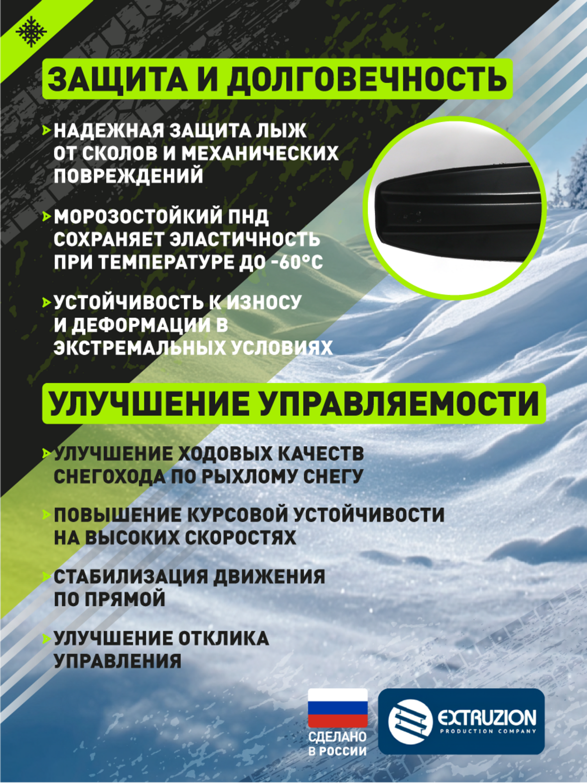 • Специализированная накладка на лыжи для снегохода «Буран». Обеспечивает улучшение ходовых качеств и повышение проходимости. Защищает стандартные снегоходные лыжи от износа и повреждений при эксплуатации в сложных зимних условиях.