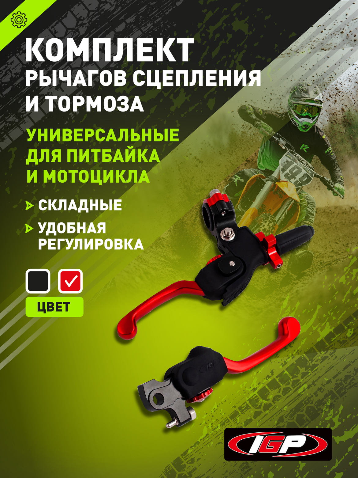 • Профессиональный комплект складных рычагов сцепления и тормоза IGP360 в красном цвете, выполнен из высококачественного алюминия методом CNC-обработки. Обеспечивает отличный контроль и надежность в любых условиях. Рычаг сцепления — универсальный, подходит для большинства питбайков, мотокроссовых и эндуро-мотоциклов. Тормозной рычаг предназначен для установки на тормозные машинки Brembo, которые используются на мотоциклах KTM и их аналогах.