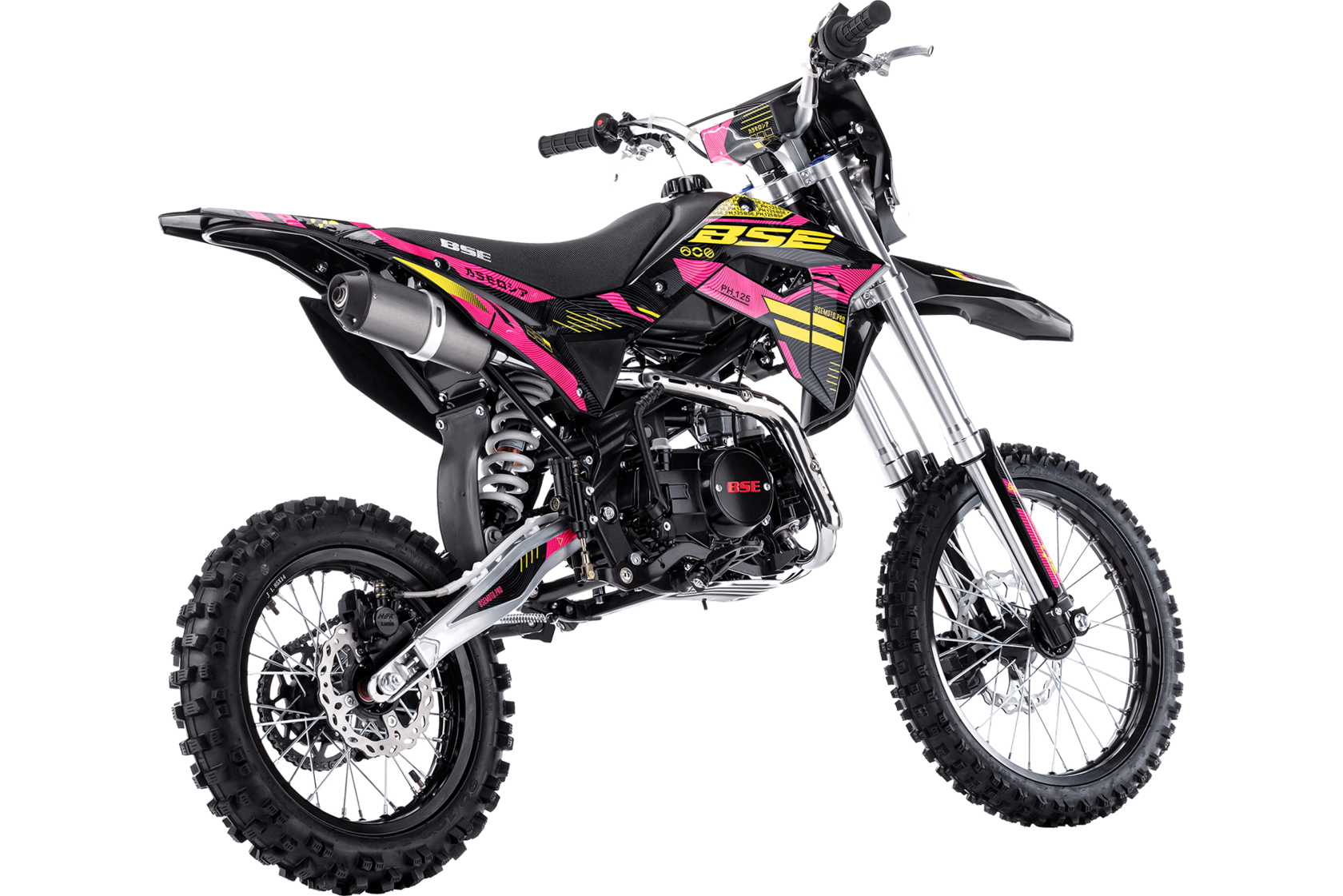 Питбайк BSE PH125 на колесах 17/14 дюймов – один из самых популярных, надежных и продаваемых питбайков 125 куб см среди китайских производителей! Этот классический питбайк объёмом 125 см3 обладает рядом модификаций и полезных усовершенствований, которые дополняют его функционал и отличают от конкурентов. PH125 оснащен колесами классическим для питбайка размером колес 17/14. Основа PH125 - рама из хромомолибденовой стали повышенной жесткости с литыми усилителями - фирменный знак качества завода BOSUER! Cиловая установка питбайка – надежный, тяговитый и мощный 4-тактный двигатель Zonghshen 125 куб см с воздушным охлаждением и мощностью 10 лс. Питает мотор карбюратор Jingke PZ 26. Питбайк оснащен 4-ступенчатой механической трансмиссией. Запуск мотора осуществляется при помощи электростартера или кик-стартера. Подвески с большими ходами: передняя - телескопическая вилка перевёрнуто типа, задняя- моноамортизатор. "Злая" резина, Мощная тормозная система HSK Racing, японские колесные подшипники NTN, усиленная цепь 428 Gold, защита мотора - питбайк полностью укомплектован всем необходимым для покатушек и гонок.