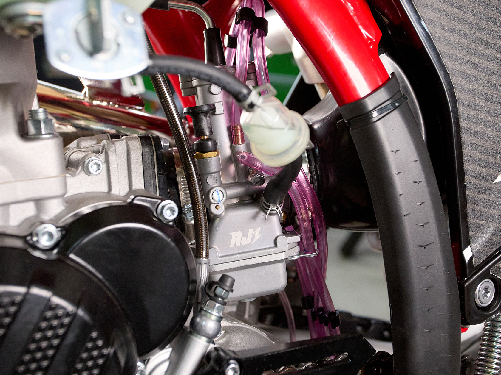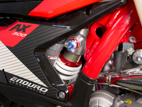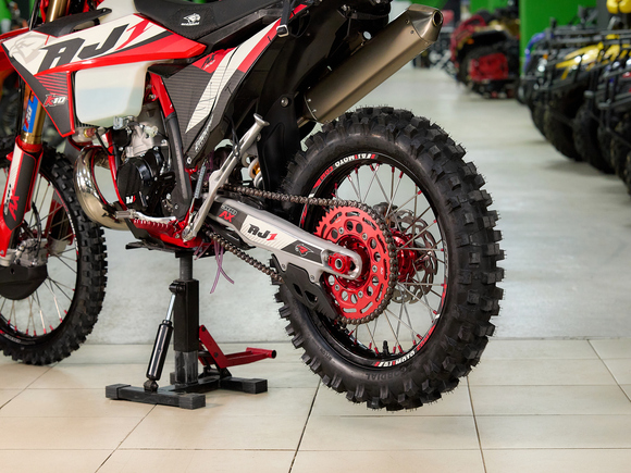 /Подробнее о AX300Модифицированная подвеска разработанная AJ1 совместно с HTW, регулировать которую можно теперь без применения инструментов, «на ходу». Двухкамерная передняя вилка с закрытым картриджем (DCC) серии AJ1-T10 с диаметром пера 48 мм и длиной 940 мм, в которой используются двукомпонентные сальники SKF Италия, а также высококачественные направляющие от японской фирмы DID ЯпонияМоноамортизатором HTW T10 регулировка без инструмента с системой PDSНовые фрезерованные траверсы со всеми регулировками а также руль переменного сечением из высокопрочного алюминиевого сплава марки 7075-T6.Новая запатентованная конструкция воздушного фильтра AJ1-Pro Red. Предварительно пропитанный смазкой - фильтр специально создан для обеспечения максимального потока воздуха, сделанный из негорючего материала.Новые радиаторы и дефлекторы воздуха позволили повысить набегающий поток и улучшить охлаждение при движении.Широкие фрезерованные подножки AJ1 из алюминиевого сплава, со сменными шипами из нержавеющей стали.Обода из алюминия 7050-T6 в стандартной комплектации имеют подшипники NSK, 4-мм спицы из нержавеющей стали и алюминиевыми ниппелями в сочетании с новыми шинами AJ1 soft compound обеспечивает постоянное сцепления колес в разных дорожных условиях.Размер колес: перед – 80/100-21 зад – 120/100-18Новый алюминиевый маятник без прогрессии + направлющими с низким коэффициентом трения обеспечивает лучший контроль и экономию веса, необходимую на треке и в горах.Запатентованная тормозная система AJ1 зарекомендовавшая себя, как лучшая в классе, великолепно работающая с тормозными дисками нового дизайн и синтетическими спеченными тормозными колодками Elig Тайвань. Спереди установлен двухпоршневой суппорт AJ1 в сочетании с диском диаметром 260 мм. Сзади – однопоршневой суппорт с диском диметром 220 ммВ стандартную комплектацию входит новая алюминиевая складывающаяся боковая подставку нового дизайна, а также фирменное сиденье AJ1Anti Skid, выполненным из нескользящего материала со специальными прорезиненными вставками.Ведомая звезда AJ1 520 на 52 зубаВыхлопная титановая система AJ1 с Power Bomb и DB-Killer (съёмный) легче на 1 кг предыдущих выхлопных систем от AJ1.