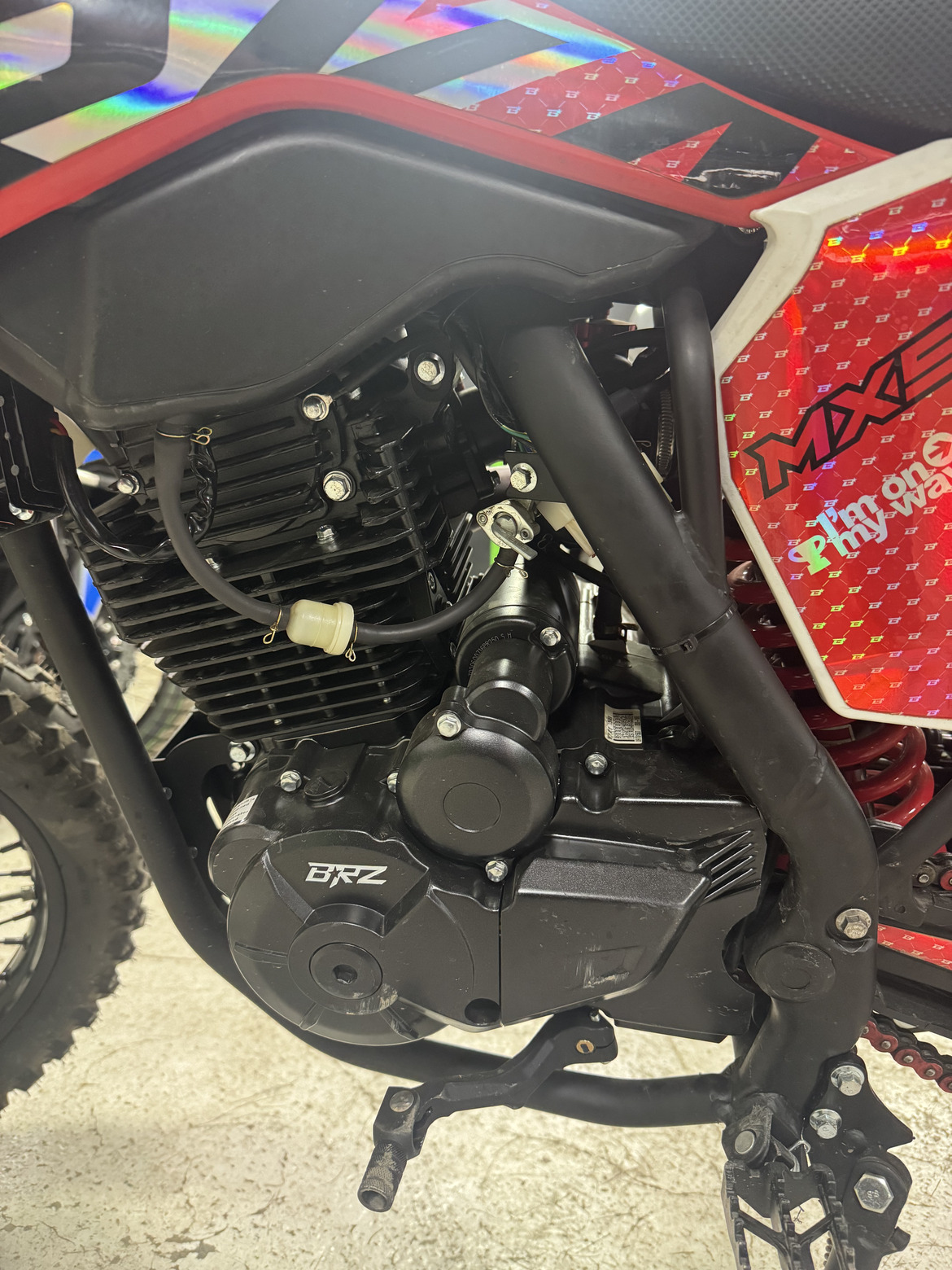 Абсолютно новый мотоцикл BRZ MX5 PR300 RED с небольшой неисправностью -не хватает регулировочного винта на стойке амортизатора.