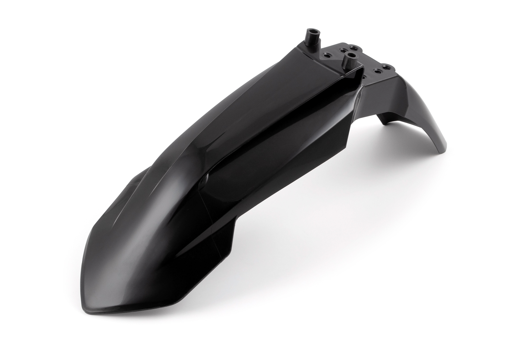 Площадка крепления к нижней траверсе (4 отверстия) обеспечивает надежную фиксацию. Кроме того, наличие двух специальных направляющих выступов (пинов) в верхней части гарантирует правильную и плотную стыковку крыла с кроссовым щитком (номерной панелью) или маской фары в стиле KTM.