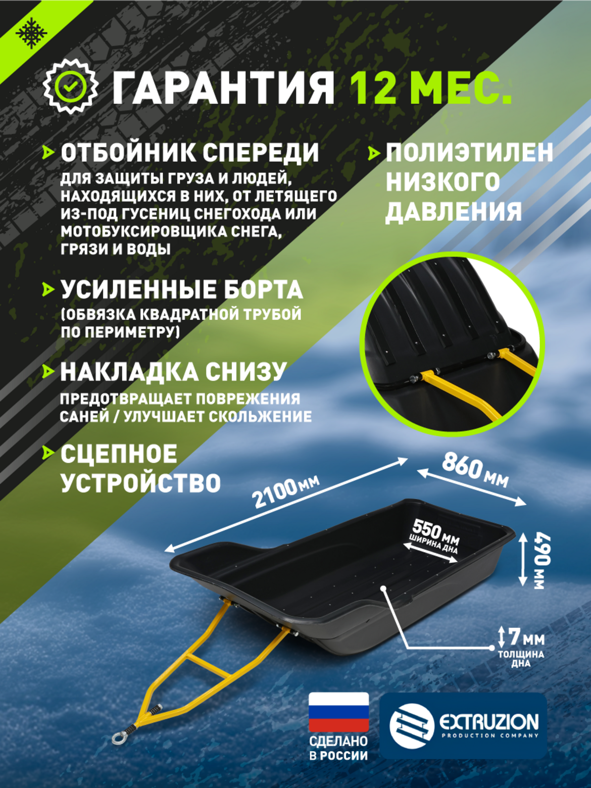• Крупногабаритные сани-прицеп для профессионального использования с снегоходами и мотобуксировщиками. Увеличенные габариты 2100×860×490 мм обеспечивают повышенную вместимость для перевозки объемных грузов. Изготовлены из сверхпрочного ПНД с УФ-стабилизацией. Комплектуются сцепным устройством, стропами обвязки и накладными полозьями для улучшенного скольжения.