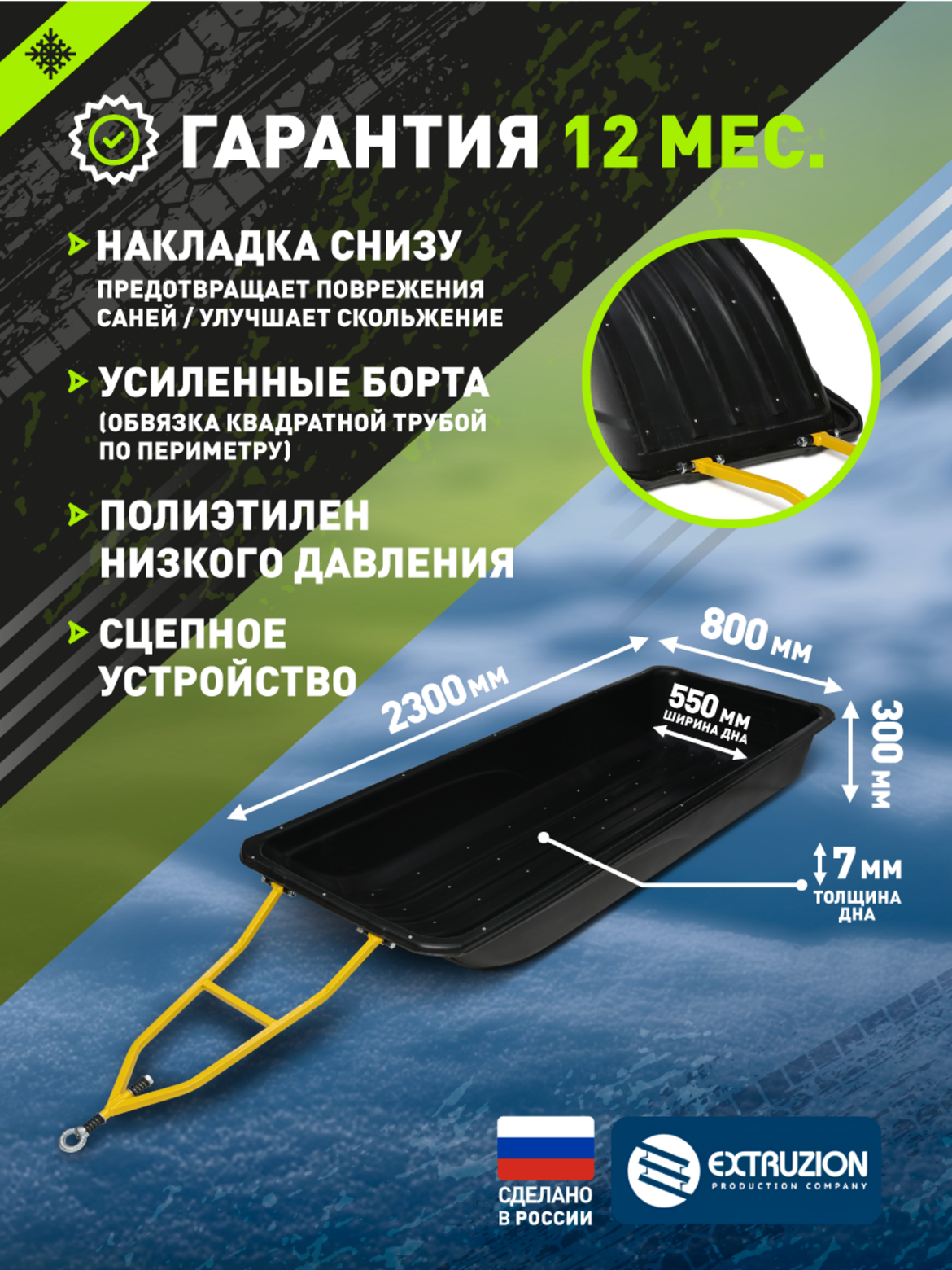 • • Комплектация: сцепное устройство + стропы обвязки + полозья