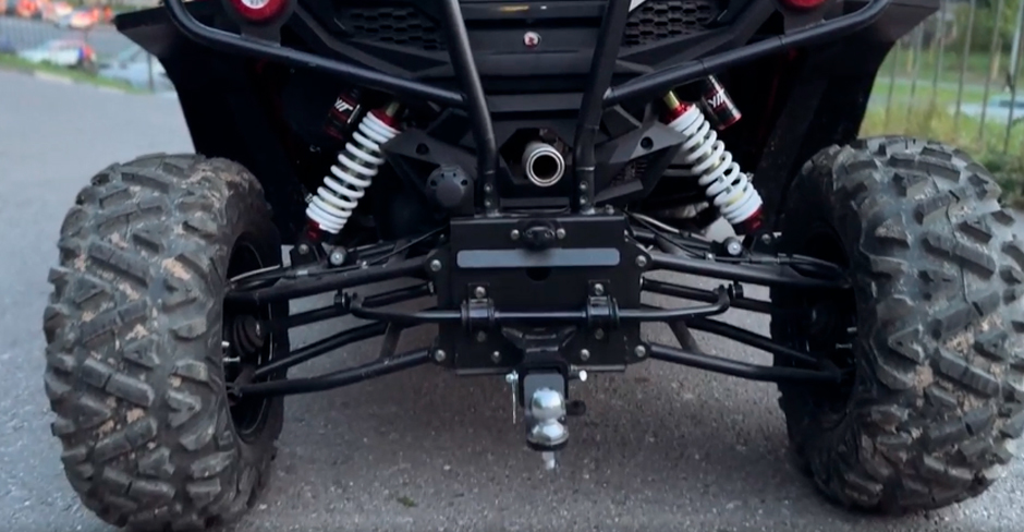 Независимая подвеска на двойных А-образных рычагах — ключевой элемент комфорта и проходимости. Ход спереди составляет 110 мм, сзади — 95 мм. Такая геометрия позволяет гасить удары от кочек, камней и корней, сохраняя контроль над машиной. Опциональные азотные амортизаторы превращают багги в ещё более жёсткий инструмент для экстремальных условий: они лучше справляются с повторяющимися нагрузками и повышают устойчивость на высоких скоростях.