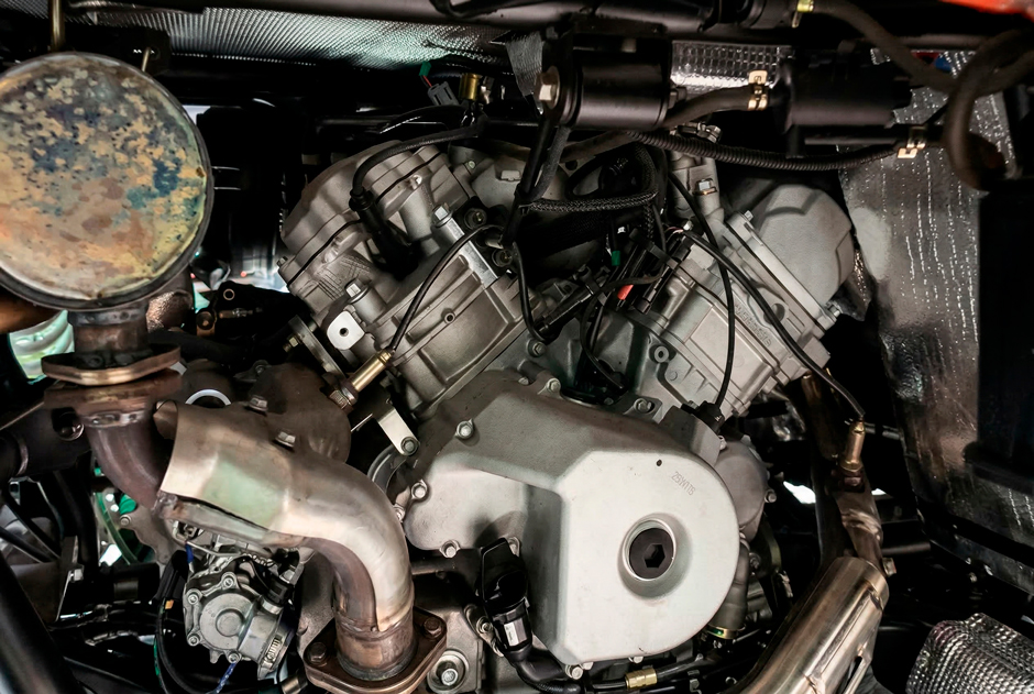 Двухместный салон продуман до мелочей. Удобная посадка, достаточное пространство для ног и продуманная эргономика позволяют чувствовать себя комфортно даже на длинных маршрутах. Приборная панель информативна: тахометр, датчики топлива и температуры, индикаторы передачи и привода — вся необходимая информация под рукой. 12-вольтовая розетка позволяет подключать гаджеты, навигатор или портативный холодильник.