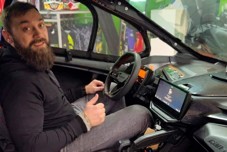 Салон багги BRP Maverick после тюнинга — это не просто кабина, а космический корабль в миниатюре. На центральной консоли размещён штатный ЖК-дисплей, выводящий всю необходимую информацию и позволяющий оценивать состояние техники в движении. Любителям музыки понравится возможность установки дополнительных колонок: тут можно без труда устроить собственную вечеринку на открытом воздухе.