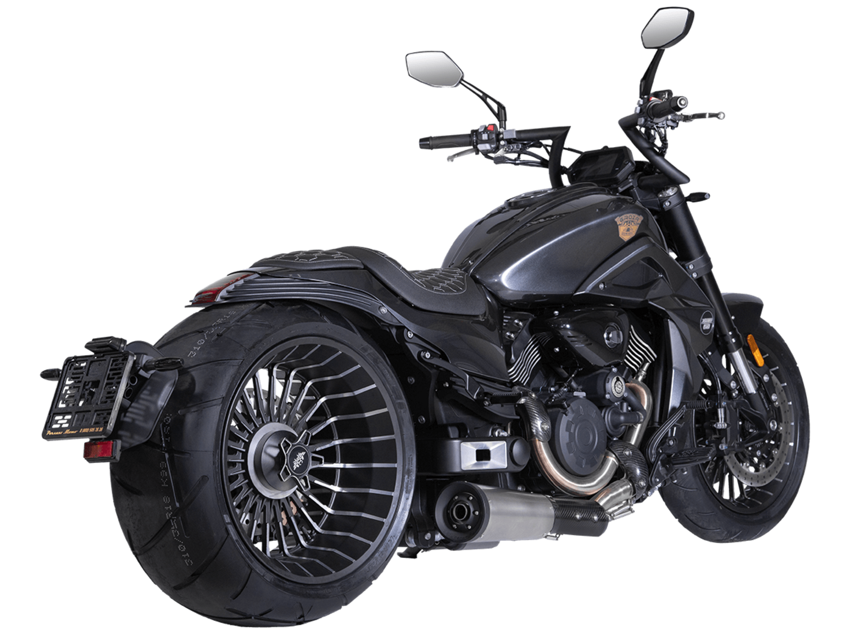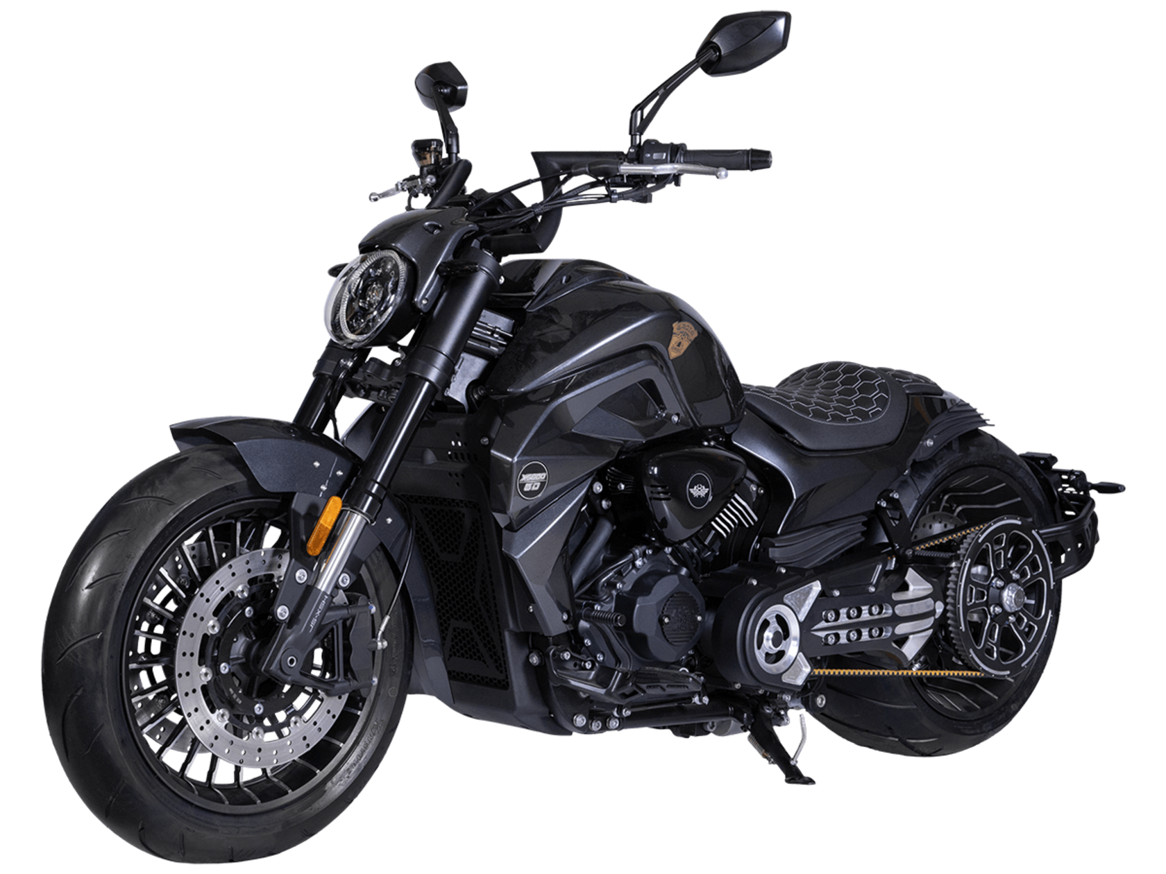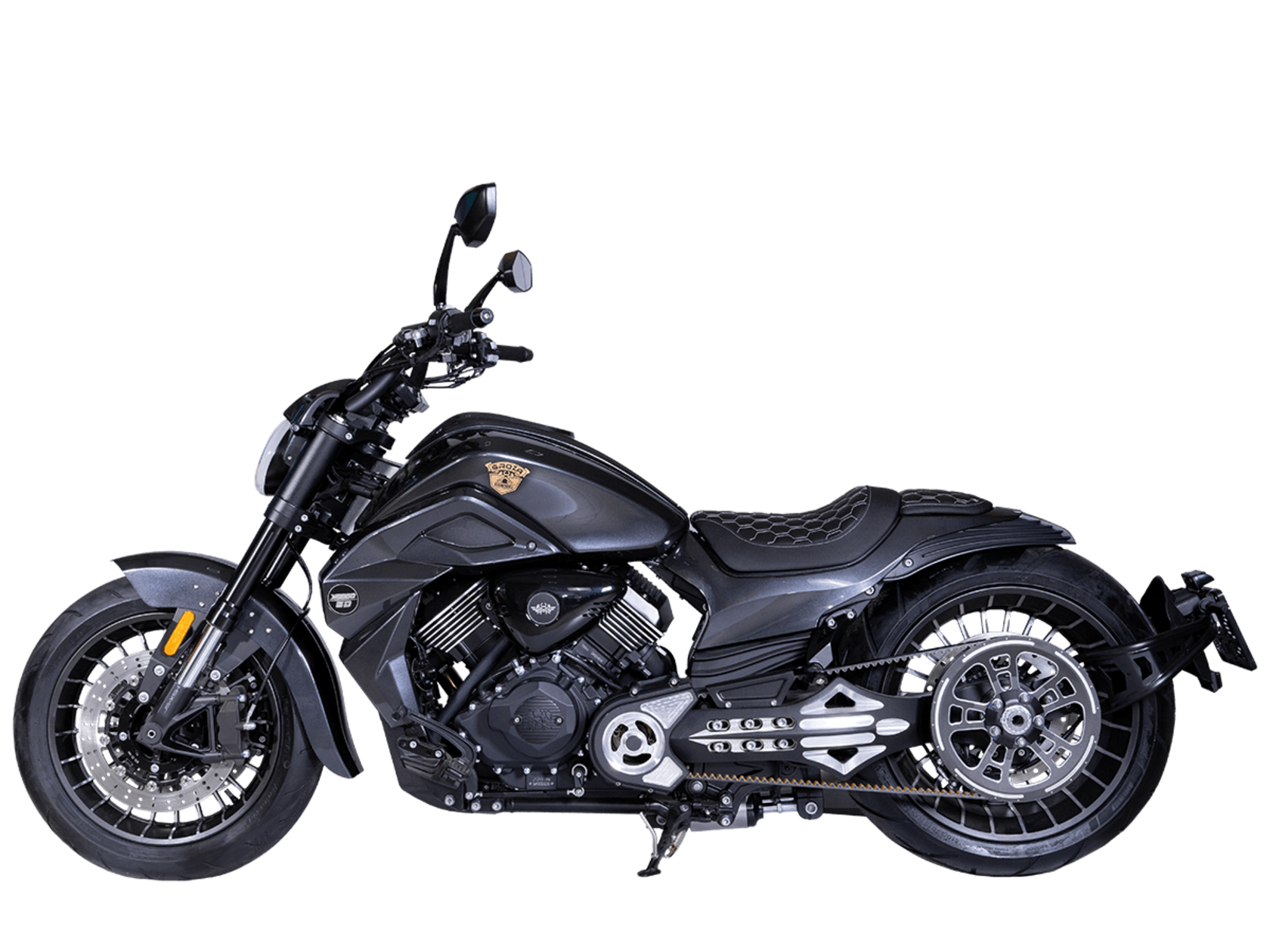 GROZA Timberwolf 800 – это не просто средство передвижения, а воплощение силы и выносливости, скрытых под привлекательным внешним видом.Сердце мотоцикла – производительный и надёжный V-образный 2-х цилиндровый 4-тактный двигатель с 4 клапанами жидкостного охлаждения. Максимальная скорость, которую может развить модель, – 160 км/ч.Механическая коробка передач имеет 6 ступеней. Ремень вариатора, произведённый компанией USA Gates, гарантирует долговечность. Топливная система представлена инжектором DELPHI. Запуск двигателя осуществляется с помощью электростартера.Передняя подвеска – перевернутая телескопическая регулируемая вилка с ходом 135 мм, задняя подвеска – пневматическая, регулировка которой осуществляется кнопками на руле или с брелока. Спереди о безопасном замедлении заботятся 2 4- поршневых суппорта с тормозными дисками 320 мм, сзади однопоршневой суппорт с плавающей скобой и тормозным диском 260 мм. Кованые алюминиевые колёса имеют размер 17х18 дюймов. На обоих колёсах есть ABS-система.Отличительная черта модели – увеличенная задняя покрышка 310 мм, которая делает вождение более устойчивым. Размеры модели 2420x890x1130 мм. Колёсная база 1650 мм. Клиренс 130 мм. Масса 288 кг. Топливный бак вмещает 22 л.Приборная панель представлена TFT-дисплеем с возможностью подключения смартфона. LED-оптика обеспечивает яркое освещение. Есть функция настройки сиденья по высоте – от 650 мм до 700 мм.GROZA Timberwolf 800 – сочетание потрясающей динамики, плавной подвески и брутального облика.Комплектация и внешний вид мотоцикла могут отличаться в зависимости от поставки. Изображение на сайте не гарантирует наличия тех или иных опций. Уточняйте информацию при оформлении заказа.