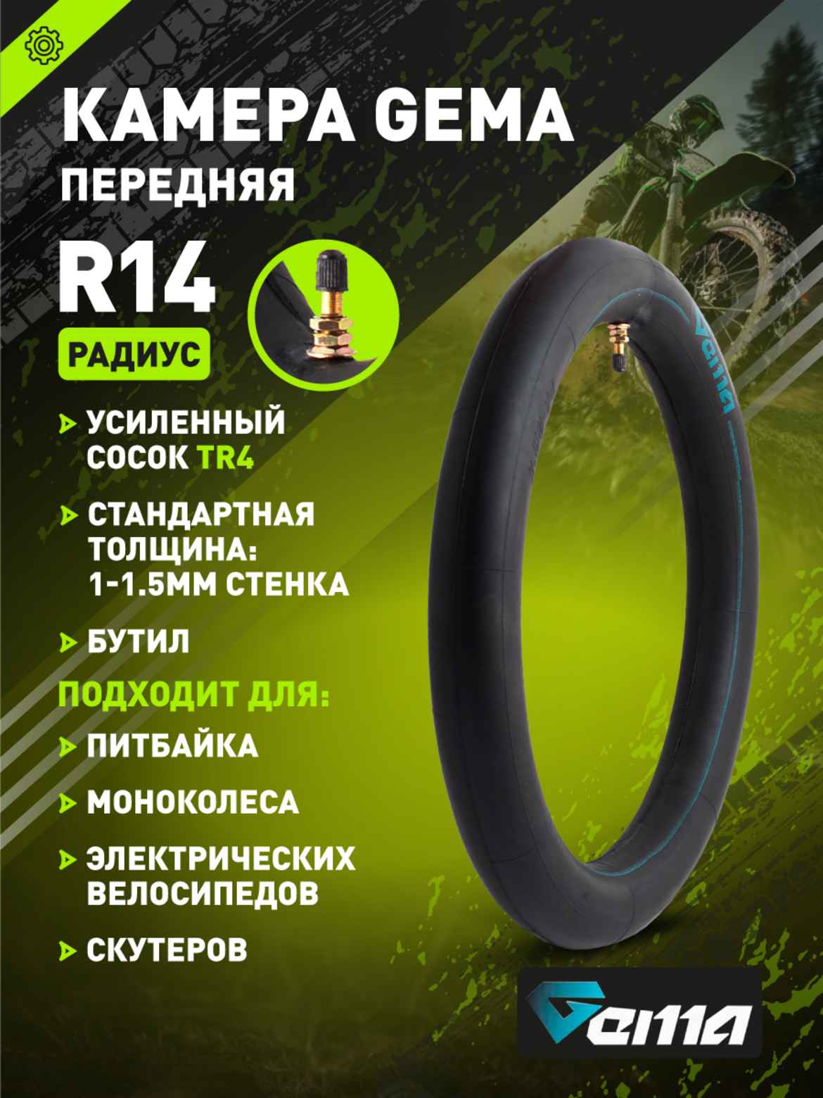 Усиленная камера GEMA для переднего колеса питбайка 14", рассчитана на высокие нагрузки и эксплуатацию в сложных условиях. Отличается прочным бутиловым корпусом с толщиной стенки 1-1,5 мм, что обеспечивает надёжную защиту от проколов, истирания и разрывов. Рекомендуется для мотокросса, эндуро и активной езды по бездорожью.Основные характеристики: