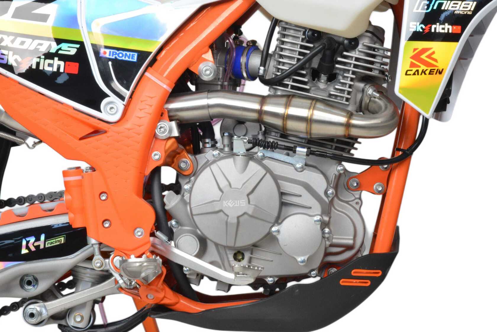 Kews K 24 оснащен мощным мотором 174 FMN NB объемом 300 куб. см с воздушным охлаждением. Это обеспечивает отличную производительность и надежность, а также позволяет мотоциклу уверенно справляться с разными типами трасс и сложными условиями.Мотоцикл оборудован 6-ступенчатой механической коробкой передач, что обеспечивает гибкость в выборе режима езды и позволяет оптимально использовать мощность двигателя в различных условиях.Kews K 24 имеет карбюратор NIBBI PWK 32, который обеспечивает эффективное топливопитание и оптимальную работу двигателя даже в сложных условиях. Это способствует улучшению динамики разгона и общей надежности работы мотора.Мотоцикл оснащен усиленными спицами и алюминиевыми ободами от компании UNISON, что улучшает прочность колес и устойчивость к ударам при езде по сложным маршрутам. Подвеска Kews K 24 имеет все возможные регулировки, что в свою очередь, позволяет настроить мотоцикл под разные задачи и условия езды , и чувствовать себя уверенно на различных трассах.