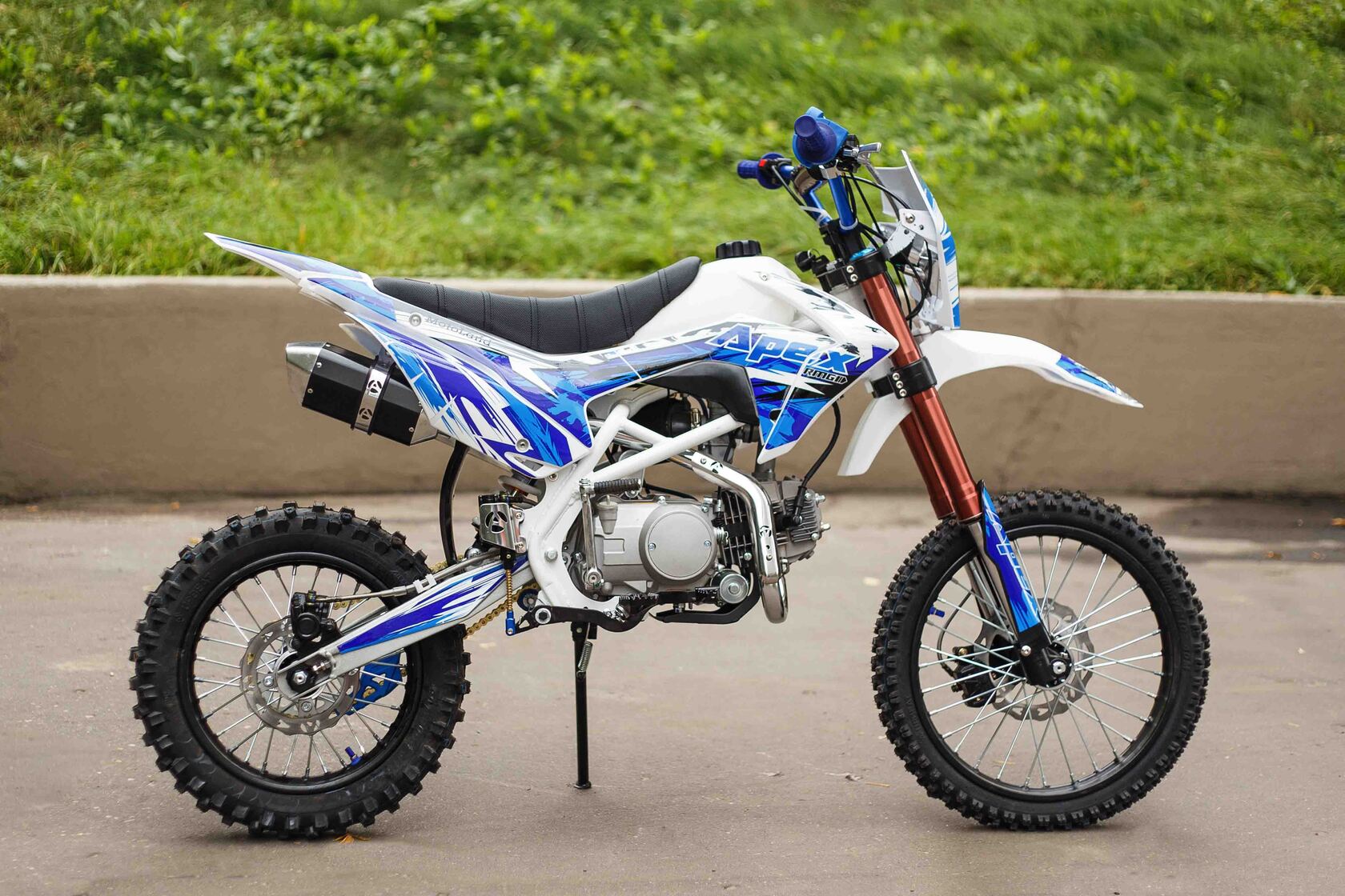 О надёжный питбайк APEX125 идеален для поездок по грунтовым дорогам и бездорожью. Хорошо чувствует себя на мягком и среднем грунте, разгоняется до 90 км/ч. Оснащён CNC траверсами, фарой, алюминиевыми ободами, весит всего 90 кг. Питбайк прост в управлении и не требует специального ухода, подойдёт как новичкам, так и любителям мотокросса.У кроссового мотоцикла APEX125 отличный узнаваемый дизайн. Конструкция подчёркивает неуступчивый спортивный характер питбайка, который не остановится ни перед одним препятствием. Пластик комбинированный, прочный, не ломается при сгибании. Кроссовый мотоцикл APEX125 доступен в красном и синем цвете, при этом в основной цвет окрашен не только пластик, но и обода колёс и другие детали питбайка.Передняя подвеска — телескопическая нерегулируемая вилка перевёрнутого типа, которая отлично подходит для преодоления ям, ухабов и других неровностей плохих дорог или их отсутствия. Задняя подвеска маятниковая с моноамортизатором. Руль 22 мм с высоким подъёмом и перекладиной удобен для мотоциклистов разного роста. Ручки руля — комфортные PRO TAPER. Питбайк оснащён складными рычагами сцепления и переднего тормоза, а также CNC-лапкой переключения передач.Питбайк весит всего 75 кг, при этом выдерживает вес до 150 кг. Оснащён CNC траверсами, рама полудуплексная стальная, мотоцепь качественная. Колёса спицованные, сделаны из прочного и лёгкого алюминия. Размер заднего колеса — 14 дюймов (350 мм), переднего — 17 дюйм (430 мм). Тормоза дисковые, передний тормозной суппорт двухпоршневой, задний — однопоршневой.Питбайк оснащён карбюратором с фильтром нулевого сопротивления VM22 MIKUNI и одноцилиндровым четырёхтактным двигателем с воздушным охлаждением. Надёжный мотор мощностью 9 л. с. и объемом 125 см³ разгоняет кроссовый мотоцикл APEX125 до 90 км/ч. Коробка передач механическая, четырёхступенчатая. Система зажигания электронная (CDI), для запуска двигателя можно использовать кикстартер и электростартер.СверхпроходимостьПокрышки с шипами и высоким грунтозацепом идеальны для бездорожья. Мощность мотора и небольшой вес питбайка позволяют ему преодолевать значительные препятствия и непролазную грязь, хорошо заходить в подъёмы.Для поездок при низкой видимости и в ночное время суток питбайк оснащён фарой, которая включается при повороте замка зажигания (1 – выключить, 2 – включить, 3 – свет). Также в комплекте есть щиток для номера, который ставится вместо фары.Питбайк 125 относится к недорогим моделям, которые при должной эксплуатации работают без сбоев и капризов. Кросс неприхотлив в обслуживании, не занимает много места в гараже. При необходимости в нём легко сменить любую повреждённую деталь. Купить питбайк 125 вы можете в официальном магазине Мотолэнд, здесь же всегда можно приобрести запасные детали и комплектующие, которые стоят недорого и всегда есть в продаже. При покупке питбайка не забудьте о защитной экипировке.