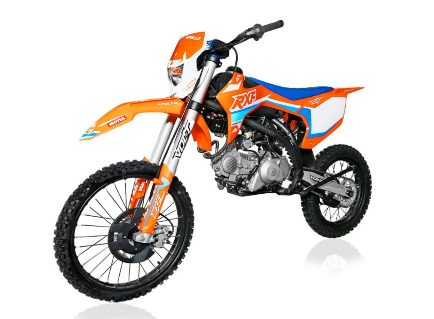 Питбайки компании Apollo родом из Франции. Головной офис компании расположен в Париже. Идеология, заложенная в бренд, носит спортивный характер. Улучшение “породы” происходит в гонках.Модели Apollo RXF (19/16) безошибочно узнаваемы благодаря хребтовой раме с V образным профилем боковой проекции начинающейся от точки крепления маятника под углом 45 градусов. Геометрия рамы была переработана и полностью учитывает размерность применяемых колес, а расстояние от подножек до седла одно из самых больших, что в свою очередь благотворно влияет на езду в стойке.Подвески питов оснащаются вилками и амортизаторами volt, топовые модели имеют регулировки по отбою. На всех моделях установлены двигатели YX, с объемами: 125, 140 и 150 см3 (последний с разными типами ГБЦ) Так же в модельном ряде появился самый кубатурный мотор ZongSheng 190 см3, оснащенный 5 ступенчатой КПП и электростартером.Хочется отметить, что компания Apollo в линейки RXF, закончило полноценную интеграцию и оптимизацию моделей под “большие колеса”. Это можно заметить при взгляде на питбайки в боковой проекции. Расстояние между баком и рулевой колонкой потеряло “зазор”, причина которого крылась в наращивание переднего треугольника под 17 колесо. Сейчас это пространство полноценно поглотил бак, который в свою очередь увеличил объем с 4,7 литров до внушительных 6,5 л. Полностью новый пластик оптимизирован под пропорции “выросшего питбайка”, сиденье стало тоньше и изящнее, боковые щитки увеличены в размерах, глубокий разрез по боковой линии подчеркивает раму, удлиненное заднее крыло и полностью новое передние, не оставляют шансов грязи. Тормозные диски получили пластиковую защиту, амортизатор брызговик, а карбюратор фильтрбокс. Продуманность компоновки питбайка выгодно отличает данную марку от других брендов.Проделанная работа позволила вернуть визуальную целостность модели, которой обладала вся серия Apollo на колесах 14/12.