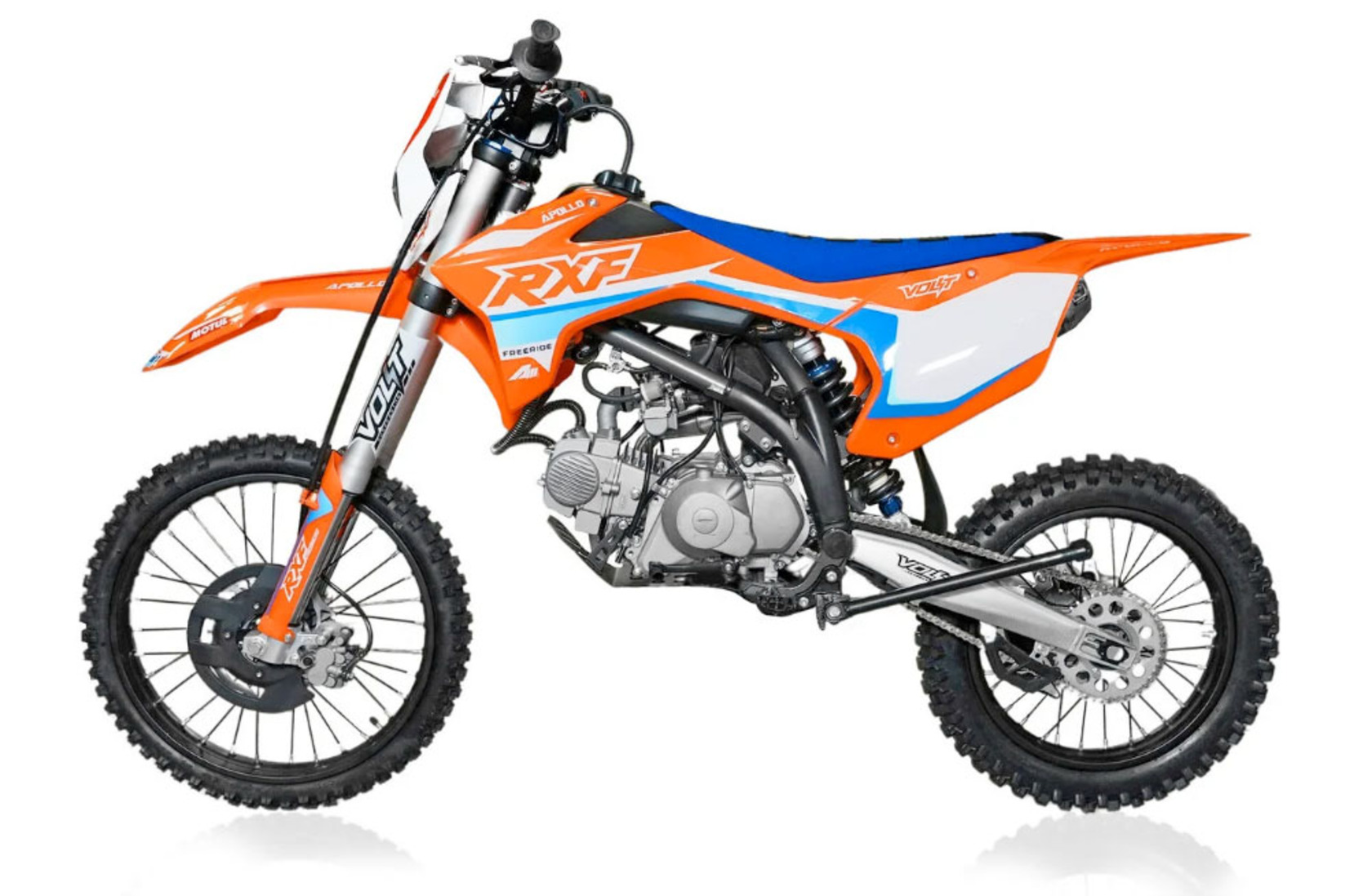 Питбайки компании Apollo родом из Франции. Головной офис компании расположен в Париже. Идеология, заложенная в бренд, носит спортивный характер. Улучшение “породы” происходит в гонках.Модели Apollo RXF (19/16) безошибочно узнаваемы благодаря хребтовой раме с V образным профилем боковой проекции начинающейся от точки крепления маятника под углом 45 градусов. Геометрия рамы была переработана и полностью учитывает размерность применяемых колес, а расстояние от подножек до седла одно из самых больших, что в свою очередь благотворно влияет на езду в стойке.Подвески питов оснащаются вилками и амортизаторами volt, топовые модели имеют регулировки по отбою. На всех моделях установлены двигатели YX, с объемами: 125, 140 и 150 см3 (последний с разными типами ГБЦ) Так же в модельном ряде появился самый кубатурный мотор ZongSheng 190 см3, оснащенный 5 ступенчатой КПП и электростартером.Хочется отметить, что компания Apollo в линейки RXF, закончило полноценную интеграцию и оптимизацию моделей под “большие колеса”. Это можно заметить при взгляде на питбайки в боковой проекции. Расстояние между баком и рулевой колонкой потеряло “зазор”, причина которого крылась в наращивание переднего треугольника под 17 колесо. Сейчас это пространство полноценно поглотил бак, который в свою очередь увеличил объем с 4,7 литров до внушительных 6,5 л. Полностью новый пластик оптимизирован под пропорции “выросшего питбайка”, сиденье стало тоньше и изящнее, боковые щитки увеличены в размерах, глубокий разрез по боковой линии подчеркивает раму, удлиненное заднее крыло и полностью новое передние, не оставляют шансов грязи. Тормозные диски получили пластиковую защиту, амортизатор брызговик, а карбюратор фильтрбокс. Продуманность компоновки питбайка выгодно отличает данную марку от других брендов.Проделанная работа позволила вернуть визуальную целостность модели, которой обладала вся серия Apollo на колесах 14/12.