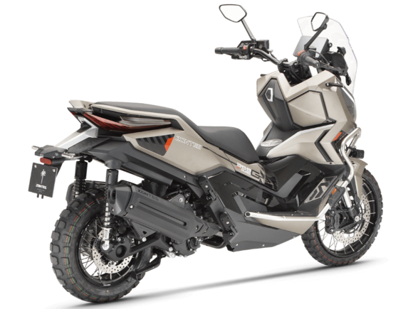 Колёсная база 1560 мм обеспечивает высокую устойчивость в поездках. На скутер установлены спицованные колёса диаметром 17 дюймов спереди и 14 дюймов сзади. В прохождении неровностей помогает клиренс 185 мм. В версии 2026 года обновились амортизаторы: спереди установлена телескопическая вилка производства MZKS, а задние амортизаторы обзавелись 5-ступенчатой регулировкой преднатяга. Ход подвески составляет 150 мм спереди и 102 мм сзади. На оба колеса установлены гидравлические дисковые тормоза от J.JUAN (холдинг BREMBO). Передний тормоз имеет диск диаметром 300 мм и 4-поршневой суппорт, а для заднего используется диск 240 мм и однопоршневой суппорт с плавающей скобой. Системы TCS и ABS от BOSCH повышают устойчивость в экстренных ситуациях и обеспечивают высокий уровень безопасности райдера.