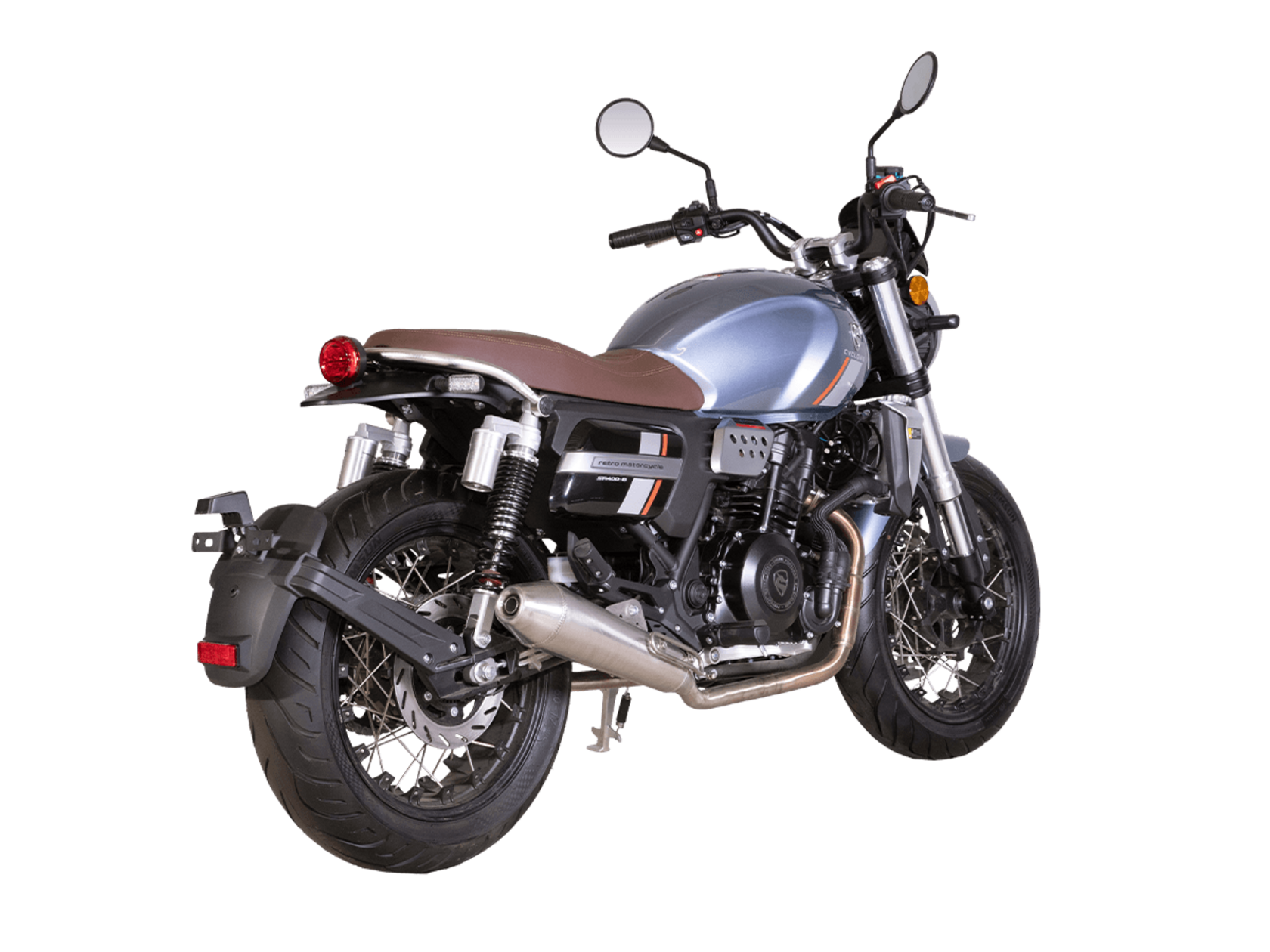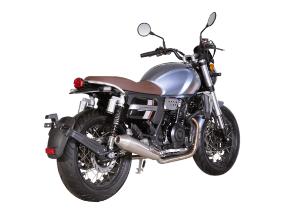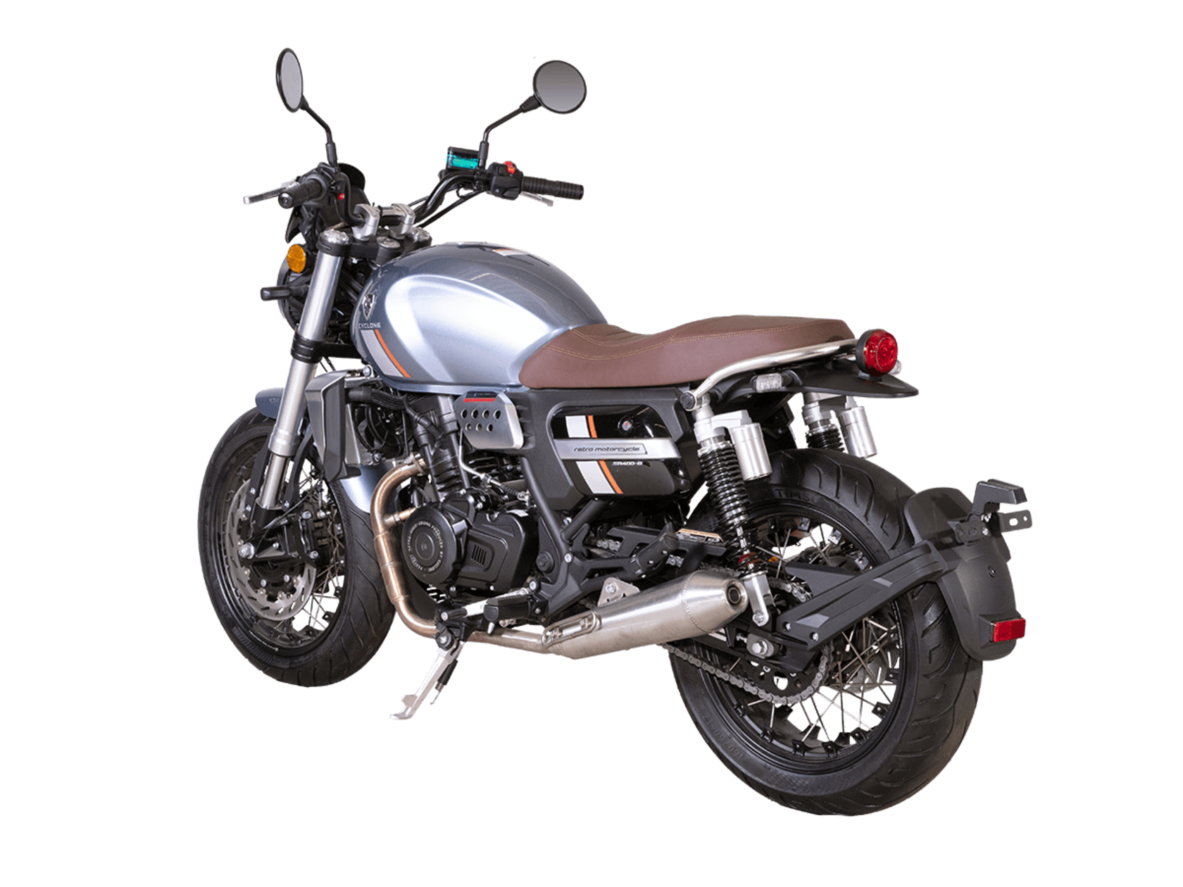CYCLONE RE401 (SR400-B) 2024 – классик, в котором подчёркнутая простота объединяется с современными технологиями. Данная модель является более продвинутой версией модели RE3 (SR-400) – мотоцикл обладает более современным дизайном, снабжён стильными металлическими накладками на радиатор, а также топливным баком, объём которого увеличен до 20 литров.Двухцилиндровый четырёхтактный двигатель объёмом 401 см3 выдаёт 43 л.с. на 9500 об/мин. Инжекторный впрыск топлива с инжектором BOSCH увеличивает топливную экономичность, а также позволяет добиться высокой приёмистости и неприхотливости агрегата. Жидкостная система охлаждения не допустит перегрева двигателя даже при самом агрессивном вождении. На мотоцикл установлена 6-ступенчатая механическая коробка передач.Максимальная скорость мотоцикла составляет 150 км/ч.RE401 оснащён классическими спицованными колёсами диаметром 17 дюймов. Колёса обуты в бескамерные покрышки TIMSUN. С неровностями дороги эффективно справляются телескопическая вилка перевёрнутого типа спереди и маятник с двумя амортизаторами сзади. Ход передней подвески составляет 130 мм, задней – 81 мм. Оба компонента подвески являются регулируемыми. Эффективное и безопасное замедление с любых скоростей обеспечивают гидравлические дисковые тормоза с ABS спереди и сзади.Клиренс мотоцикла составляет 170 мм. Объём топливного бака – 20 л. Снаряжённая масса – 186 кг.Из дополнительного оборудования можно выделить USB-порт и датчики давления в шинах.Мотоцикл сочетает в себе отличные технические характеристики, комфорт и надёжность, что позволяет вам ощутить настоящую свободу на любой дороге.