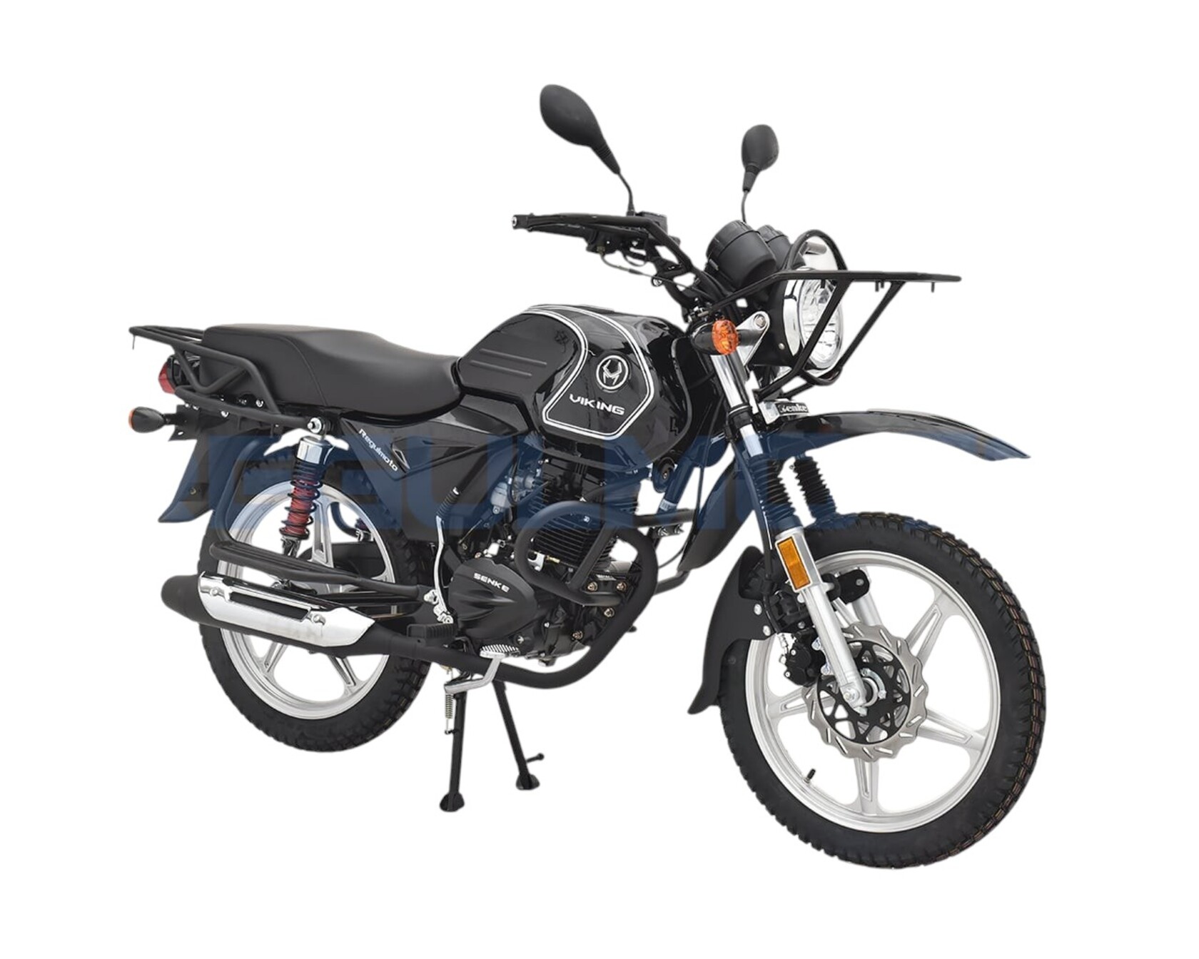 Компания «Regulmoto» представляет вниманию поклонников двухколесной мототехники мотоцикл Regulmoto VIKING – надежный и доступный для многих байк с широкими эксплуатационными возможностями. Мотоцикл Regulmoto VIKING – один из ярких представителей линейки малокубатурной мототехники известного азиатского производителя Senke. Мотоциклы производства одного из крупнейших китайских концернов пользуются заслуженным признанием экспертов и мотолюбителей в различных частях света, включая Европу и Америку. Продукцию Senke отличают не только одно из лучших на рынке соотношений достойного качества и демократичной цены, но и солидный эксплуатационный ресурс, высокая надежность, простое и недорогое сервисное обслуживание.В раме мотоцикла с 18-дюймовыми колесами на литых дисках установлен 4-тактный 150-«кубовый» двигатель с воздушным охлаждением, который способен развивать максимальную мощность в 11,6 лошадиных сил. Наличие у двигателя балансирного вала способствует снижению вибрации при работе мотора. 5-ступенчатая трансмиссия, электростартер, полноценная подвеска, представленная телескопической вилкой спереди и двумя амортизаторами и маятником сзади, приборная панель и емкий топливный бак – все это позволит получать максимум удовольствия от поездки. За безопасность использования мотоцикла отвечают надежная тормозная система (дисковый тормоз спереди и барабанный сзади), комплект светового оборудования и зеркал заднего вида.