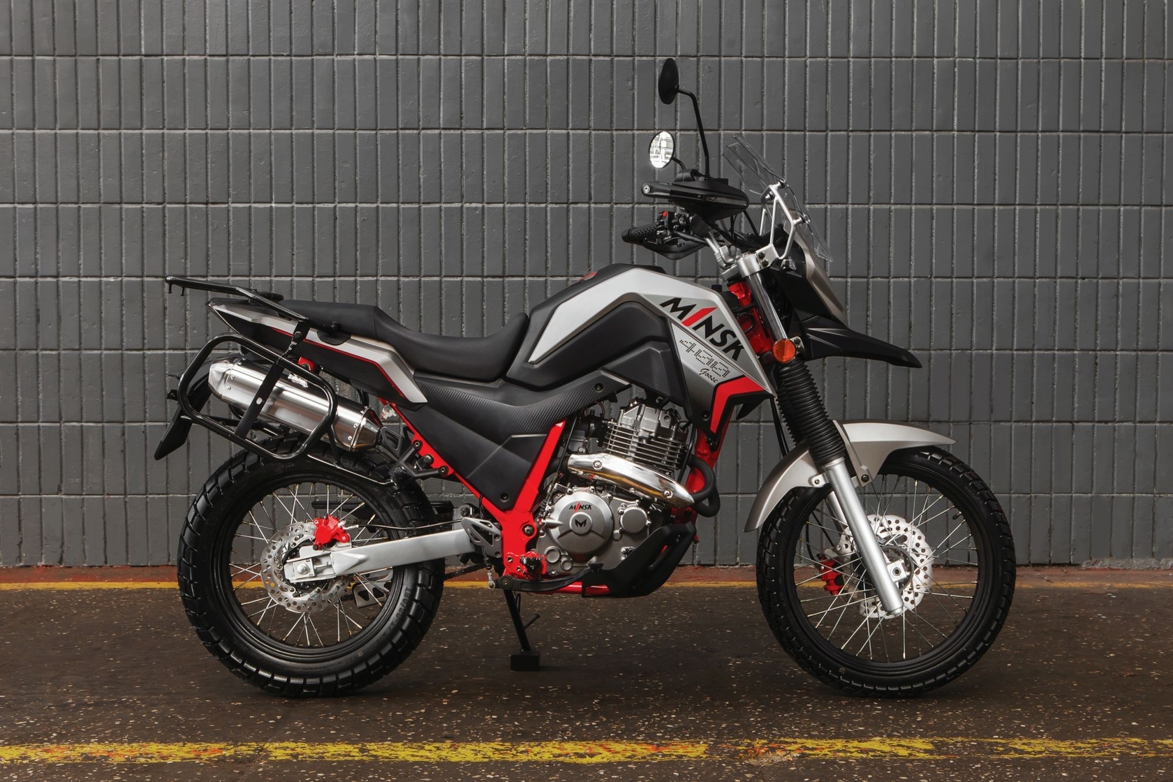 Мотоцикл Minsk GOOSE 400 - высокий ветровик, острый «клюв» переднего крыла под фарой, уверенная прямая посадка и спицованные колеса обещают комфортное передвижение как по трассам, так и по всевозможному бездорожью.Подвеска мотоцикла рассчитана на работу в условиях бездорожья, но не будет ощущаться как слишком мягкая на ровном асфальте. Двигатель одноцилиндровый, четырехклапанный, с двумя распредвалами, воздушно-масляным охлаждением и пятиступенчатой трансмиссией. В системе питания применен карбюратор. Это решение продиктовано меньшей стоимостью в сравнении с инжекторной системой питания, более простой конструкцией и повышенной ремонтопригодностью. При этом мощность двигателя составляет 27,3 лошадиные силы, с впечатляющим значением крутящего момента в 32,5 Н/м, которые выдаются уже при 5000 об/мин, позволяя развивать скорость до 120 км/ч. Воздушно-масляная система охлаждениямотора реализована с использованием передней части рамы в качестве радиатора. Это позволило исключить лишние детали и компоненты, а значит и возможность их повреждения. За характерную внешность мотоцикл еще до официального выхода на рынок получил понятное каждому турэндуро прозвище «Гусь».