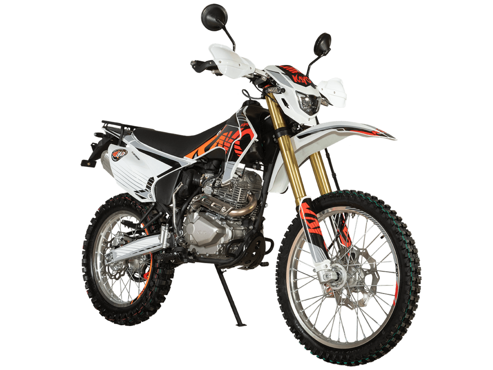 Мотоцикл KAYO T1 300 Enduro 21/18 2025 ПТС – надёжный и производительный эндуро, готовый встретить вызовы внедорожных трасс.Оснащён 4-тактным двигателем объёмом 271 см³ с верхним распредвалом и воздушным типом охлаждения. Максимальная мощность в 24 л.с. развивает при 8500 об/мин, а максимальный крутящий момент 22 Нм при 6500 об/мин. За подачу топлива отвечает карбюратор PD30. Он обеспечивает плавность хода, топливную экономность и бесперебойную работу двигателя даже в самых жёстких условиях. Соотношение диаметра цилиндра и хода поршня 75,0х61,4. Степень сжатия 9,29:1. Запуск двигателя осуществляется с помощью электростартера или кикстартера. Тип зажигания CDI. Снизу установлена пластиковая защита двигателя.Механическая коробка передач имеет 5 ступеней. Привод цепной. Объём топливного бака 9 литров.На мотоцикл установлены спицованные колёса с алюминиевыми ободами, алюминиевыми ступицами и буксаторами. Обуты во внедорожные покрышки YUANXING 80/100-21 и 110/100-18.Длина подвески спереди 880 мм, длина задней подвески 380 мм. Задняя подвеска оснащена прогрессией. Траверсы выполнены из литого алюминия, а прогрессия – из стали. За торможение отвечают дисковые гидравлические тормоза.Прочная рама и маятник выполнены из стали. Мотоцикл имеет ПТС и оснащён всем необходимым для поездок по дорогам общего пользования: диодная светотехника (яркая фара, поворотники, стоп-сигнал), звуковой сигнал, цифровая приборная панель, зеркала заднего вида.Для управления установлен руль переменного сечения 28 мм Fatbar со стандартными рычагами сцепления и тормоза, на который установлена алюминиевая защита рычагов с широкими ветрозащитными щитками. Имеется платформа для перевозки грузов и дополнительные подножки для поездок с пассажиром.Габариты мотоцикла 2100х810х1180 мм, вес 119 кг. Клиренс 340 мм, колёсная база 1420 мм, высота по седлу 900 мм.