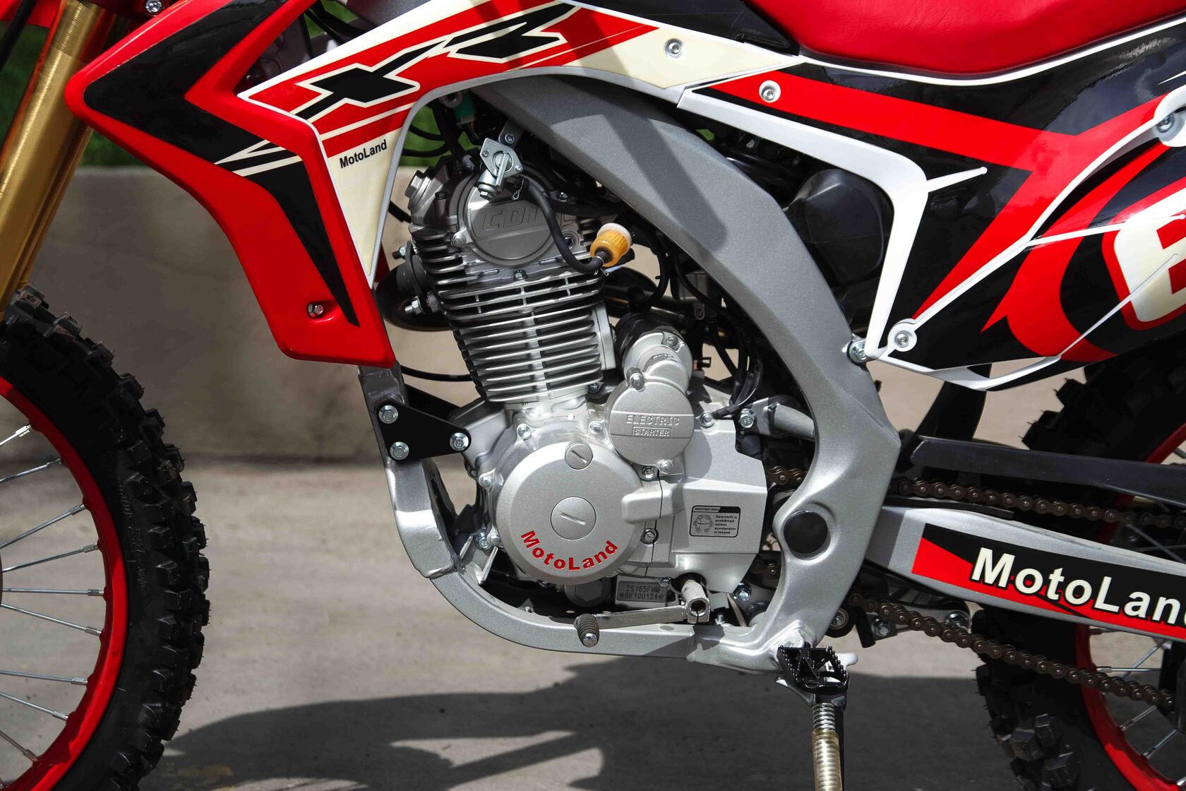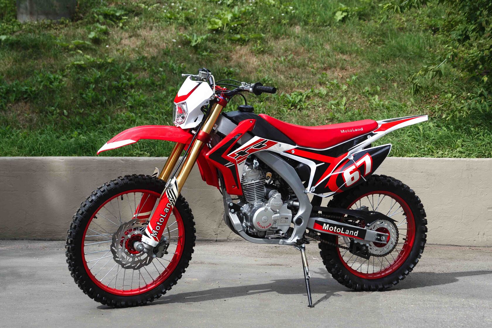 Купить Motoland 250 XR250 в стандартной комплектации будет неплохим решением для всех, кому нужен недорогой кроссовый мотоцикл, подходящий для езды по бездорожью, без выполнения прыжков и базовых трюков. Хорошее качество сборки и доступные цены на комплектующие позволяют поддерживать технику в исправном состоянии без больших затрат при любой интенсивности эксплуатации. Масса мотоцикла составляет порядка 130 кг. Габариты довольно большие – длина составляет 2000 мм., а высота по седлу – 920 мм., ширина руля- 830 мм. поэтому он отлично подойдет для тех, кто имеет рост от 175 см и выше.На мотоцикле установлен обычный для китайских кроссовых мотоциклов двигатель 169 FMM с 17 л.с. мощности, с воздушным охлаждением и рабочим объемом 230 кубов . Диаметр поршня движка составляет 65,5 мм, балансирный вал в конструкции не предусмотрен. Коленвал у мотоцикла Motoland XR 250 имеет палец диаметром 15 мм. Новые партии оснащаются карбюраторами PZ 30 с ускорительным насосом. Для удобства запуска мотора предусмотрен электростартер.Рычаги сцепления и тормоза – обычные, не складные. Передний тормозной диск имеет размер 280 мм., а размер заднего диска составляет 250 мм. Данный мотоцикл комплектуется колесами размерами 18/21 дюймов, размер задней покрышки – 110/90-18, передней- 80/100-21. Установлена 520-я цепь, передняя (ведущая) звезда имеет 13 зубов, задняя (ведомая) – 41 зуб.Подвеска у данной модели имеет стандартную прогрессию, как у большинства «китайцев». Размеры сальников прогрессии – 32х17х4, размеры подшипников – NK 17/16. Передние амортизаторы имеют размеры L=870 d51x55 мм., а задний – 460 мм, регулировки не предусмотрены. Задний маятник мотоцикла тоже стандартный, металлический.У модели Motoland XR 250 руль имеет переменное сечение: в месте установки его размер составляет 28 мм, а на концах под грипсами – 22 мм. Перевернутая вилка позволяет легче преодолевать любые неровности на дороге даже новичкам.Мотоцикл оснащен фарой головного света, что является необходимым условием для езды в сумерках и темноте. Если он покажется вам недостаточно ярким, вместо стандартной лампы можно установить LED освещение или Биксенон. Переключение света осуществляется ключом зажигания.
