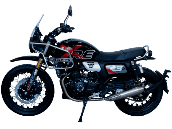 CYCLONE RE3 Scrambler (SR400-A) – универсальный мотоцикл, объединяющий в себе черты городского мотоцикла и эндуро. Управляя им, можно бросить вызов и городским пробкам, и скоростным автострадам, и всевозможному лёгкому бездорожью. Его дизайн отдаёт дань уважения каферейсерской тематике.Двухцилиндровый четырёхтактный двигатель объёмом 401 см3 выдаёт 43 л.с. на 9500 об/мин. Инжекторный впрыск топлива с инжектором BOSCH увеличивает топливную экономичность, а также позволяет добиться высокой приёмистости и неприхотливости агрегата. Жидкостная система охлаждения не допустит перегрева двигателя даже при самом агрессивном вождении. На мотоцикл установлена 6-ступенчатая механическая коробка передач.Максимальная скорость мотоцикла составляет 140 км/ч.Мотоцикл оснащён классическими спицованными колёсами диаметром 17 и 19 дюймов и имеет достаточно большой дорожный просвет – 22 см. С неровностями дороги эффективно справляются телескопическая вилка перевёрнутого типа спереди и маятник с двумя амортизаторами сзади. Ход передней подвески составляет 130 мм, задней – 81 мм. Оба компонента подвески являются регулируемыми. Эффективное и безопасное замедление с любых скоростей обеспечивают гидравлические дисковые тормоза с ABS спереди и сзади.Клиренс мотоцикла составляет 220 мм. Объём топливного бака – 19 л. Снаряжённая масса – 200 кг.На данной модели штатно установлены дуги безопасности, а также имеется бортовой компьютер с цветным дисплеем, USB-порт и подсветка пультов.RE3 Scrambler сочетает в себе отличные технические характеристики, комфорт и надёжность, что позволяет вам ощутить настоящую свободу на любой дороге с любым покрытием.