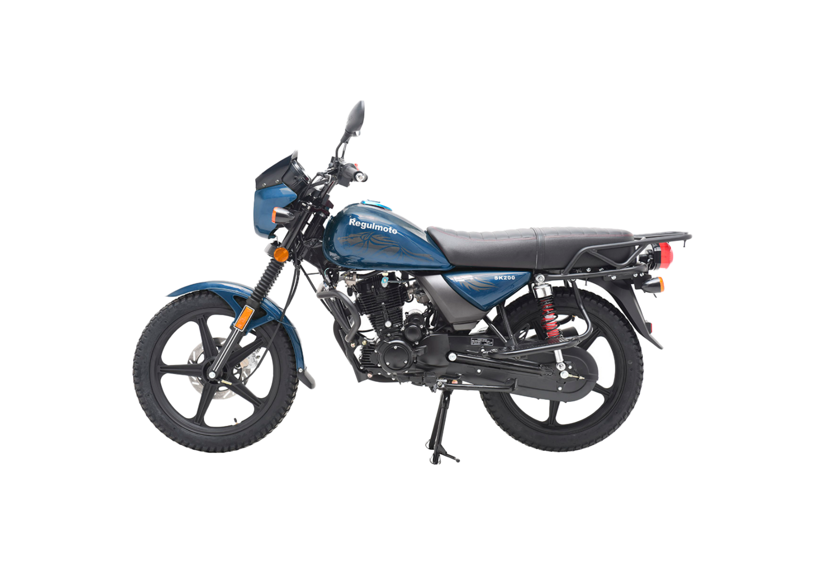 Несмотря на «классический» вид Regulmoto SK200, в комплектации мотоцикла используются современные стильные литые диски колес, световое оборудование на экономичных и долговечных светодиодах, электронное зажигание, ротор дискового тормоза на переднем колесе. Байк полностью готов к эксплуатации на ДОПах: кроме комплекта светотехники и удобной приборной панели, на руле мотоцикла также установлены зеркала заднего вида.