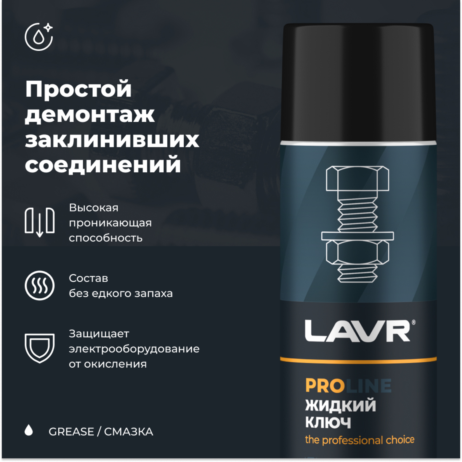 (️ Совет механика: Если болт или гайка прикипели намертво, не пытайтесь сорвать их силой сразу после распыления состава! Обильно нанесите смазку (используя комплектную трубочку, чтобы жидкость попала строго в резьбу), и подождите 2-3 минуты. Затем используйте метод «раскачки»: сначала слегка потяните ключ на ЗАКРУЧИВАНИЕ (чтобы стронуть микроржавчину), а затем уже на откручивание. Повторите распыление при необходимости — с LAVR PRO LINE открутится всё!).