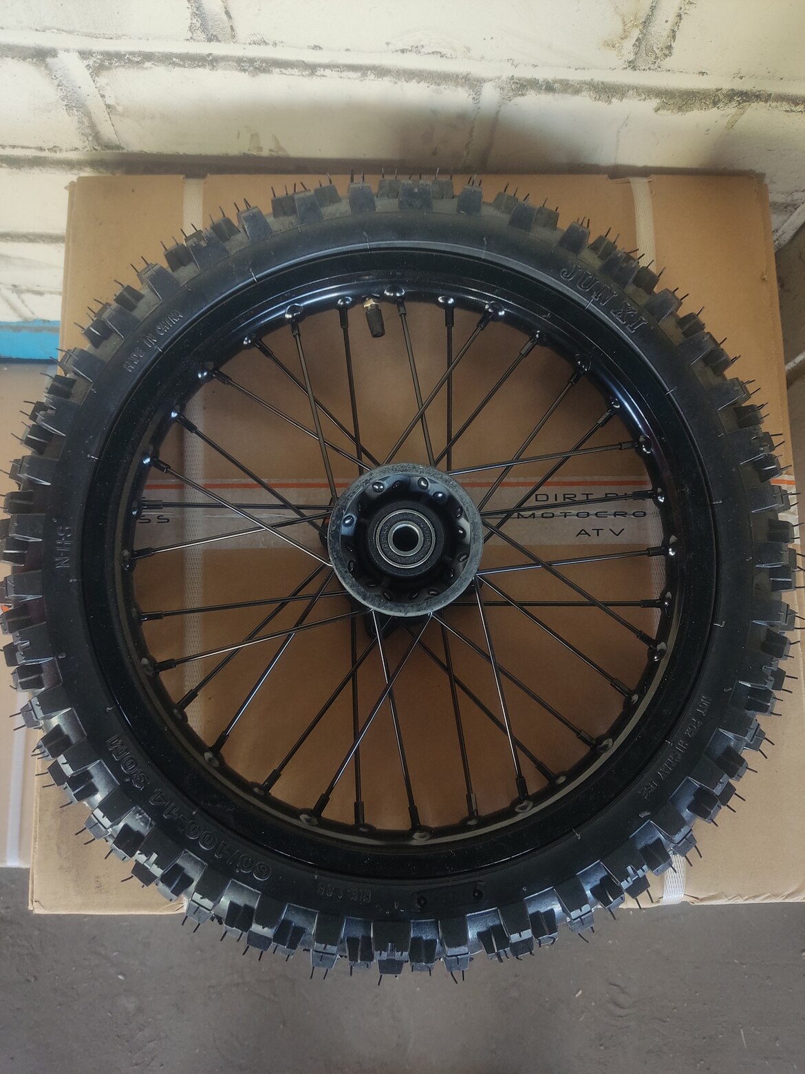 Переднее колесо в полной комплектации с покрышкой. Алюминиевый обод черного цвета диаметром 14 дюймов. Посадочный диаметр под ось 15 мм. Поставляется без тормозного диска и без оси в комплекте.