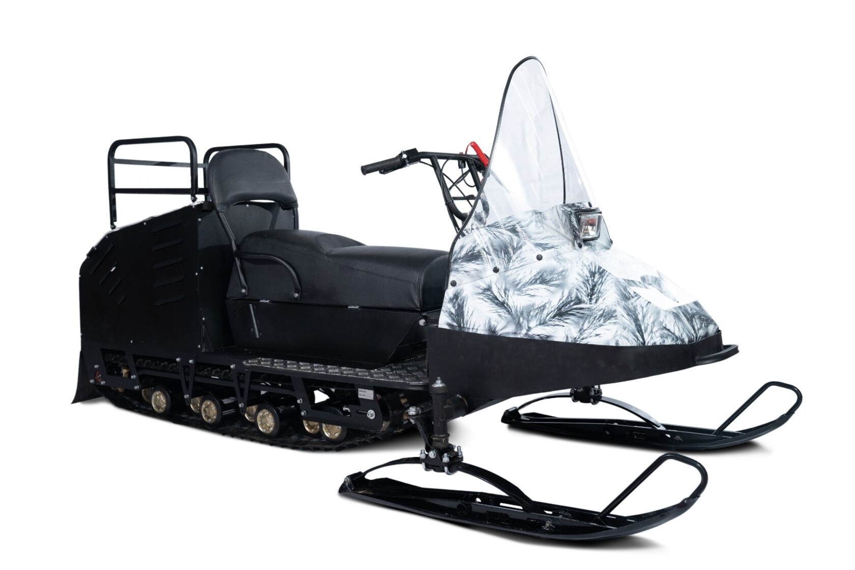 Модель Бурлак Егерь Центро-M собран на базе удлиненной гусеницы. Ширина 500 мм. Подвеска: катковая. Оснащен 4х тактным двигателем Lifan / Loncin мощностью 18 л.с.На миниснегоход установлено двухместное сиденье. Есть два больших багажных отделения под капотом и сиденьем.В качестве дополнительной опции можно установить, подогрев ручек руля и курка газа.Модель доступна в двух вариантах покраски капота: Белый и Белый Камуфляж.