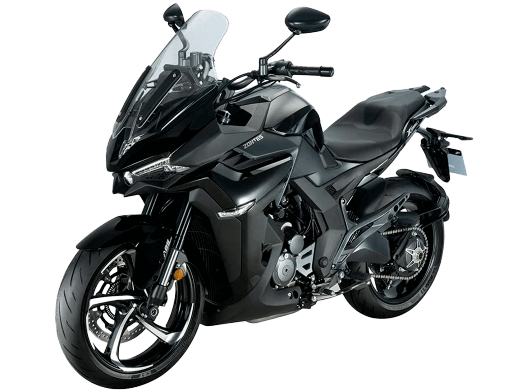 Мотоцикл ZONTES ZT350-X1 – турист со стремительным современным дизайном. Хорошо подходит как для повседневных поездок по городу, так и для покорения дальних маршрутов.Силовая установка представлена одноцилиндровым 4-тактным двигателем ZT184MP с 4 клапанами и 2 верхними распредвалами. Двигатель имеет объём 348 см³ и обеспечивает мощность в 39 л.с. Оснащён инжектором BOSCH и системой жидкостного охлаждения. Механическая коробка передач имеет 6 ступеней и схему 1-N-2-3-4-5-6. Запуск двигателя осуществляется с помощью бесключевого доступа.Ёмкость топливного бака 19 литров.Колёса представлены литыми алюминиевыми дисками диаметром 17 дюймов. На мотоцикл установлены датчики давления в шинах, показатели от которых выводятся на приборную панель. Для подвески спереди используется телескопическая вилка, сзади – моноамортизатор. Гидравлические дисковые тормоза произведены испанской компанией J.JUAN, входящей в холдинг BREMBO.Для освещения используется яркая LED-оптика, а приборная панель представлена цифровым дисплеем. Рычаги тормоза, сцепления и лапки КПП можно отрегулировать. Имеется 2 USB-порта.Габариты мотоцикла 2055х795х1330 мм. Колёсная база 1395 мм. Высота по седлу 795 мм. Вес 169 кг.