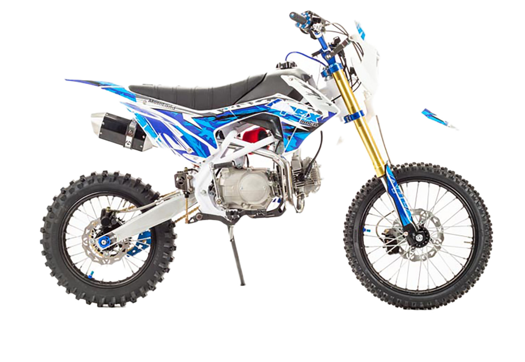 Недорогой надёжный питбайк APEX125 идеален для поездок по грунтовым дорогам и бездорожью. Хорошо чувствует себя на мягком и среднем грунте, разгоняется до 90 км/ч. Оснащён CNC траверсами, фарой, алюминиевыми ободами, весит всего 90 кг. Питбайк прост в управлении и не требует специального ухода, подойдёт как новичкам, так и любителям мотокросса.У кроссового мотоцикла APEX125 отличный узнаваемый дизайн. Конструкция подчёркивает неуступчивый спортивный характер питбайка, который не остановится ни перед одним препятствием. Пластик комбинированный, прочный, не ломается при сгибании. Кроссовый мотоцикл APEX125 доступен в красном и синем цвете, при этом в основной цвет окрашен не только пластик, но и обода колёс и другие детали питбайка.Передняя подвеска — телескопическая нерегулируемая вилка перевёрнутого типа, которая отлично подходит для преодоления ям, ухабов и других неровностей плохих дорог или их отсутствия. Задняя подвеска маятниковая с моноамортизатором. Руль 22 мм с высоким подъёмом и перекладиной удобен для мотоциклистов разного роста. Ручки руля — комфортные PRO TAPER. Питбайк оснащён складными рычагами сцепления и переднего тормоза, а также CNC-лапкой переключения передач.Питбайк весит всего 75 кг, при этом выдерживает вес до 150 кг. Оснащён CNC траверсами, рама полудуплексная стальная, мотоцепь качественная. Колёса спицованные, сделаны из прочного и лёгкого алюминия. Размер заднего колеса — 14 дюймов (350 мм), переднего — 17 дюйм (430 мм). Тормоза дисковые, передний тормозной суппорт двухпоршневой, задний — однопоршневой.Питбайк оснащён карбюратором с фильтром нулевого сопротивления VM22 MIKUNI и одноцилиндровым четырёхтактным двигателем с воздушным охлаждением. Надёжный мотор мощностью 9 л. с. и объемом 125 см³ разгоняет кроссовый мотоцикл APEX125 до 90 км/ч. Коробка передач механическая, четырёхступенчатая. Система зажигания электронная (CDI), для запуска двигателя можно использовать кикстартер.СверхпроходимостьПокрышки с шипами и высоким грунтозацепом идеальны для бездорожья. Мощность мотора и небольшой вес питбайка позволяют ему преодолевать значительные препятствия и непролазную грязь, хорошо заходить в подъёмы.Для поездок при низкой видимости и в ночное время суток питбайк оснащён фарой, которая включается при повороте замка зажигания (1 – выключить, 2 – включить, 3 – свет). Также в комплекте есть щиток для номера, который ставится вместо фары.Питбайк 125 относится к недорогим моделям, которые при должной эксплуатации работают без сбоев и капризов. Кросс неприхотлив в обслуживании, не занимает много места в гараже. При необходимости в нём легко сменить любую повреждённую деталь. Купить питбайк 125 вы можете в официальном магазине Мотолэнд, здесь же всегда можно приобрести запасные детали и комплектующие, которые стоят недорого и всегда есть в продаже. При покупке питбайка не забудьте о защитной экипировке.
