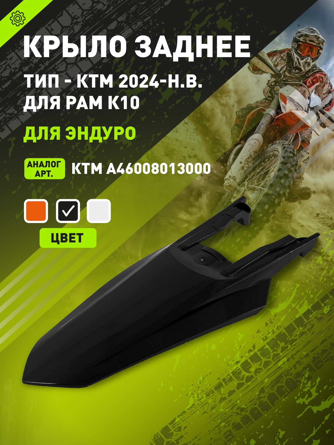 • Черное заднее крыло для эндуро мотоциклов KTM 2024 года, а также аналогичных китайских моделей на раме K10 (например, KEWS, AJ1, BRZ и др.). Изготовлено из прочного и ударопрочного пластика, полностью повторяющего форму и конструкцию KTM 24г. Является полным аналогом оригинальной детали KTM с артикулом A46008013000EB. Легко устанавливается на штатные крепления без доработок и обеспечивает надежную защиту задней части мотоцикла от грязи, воды и механических повреждений.