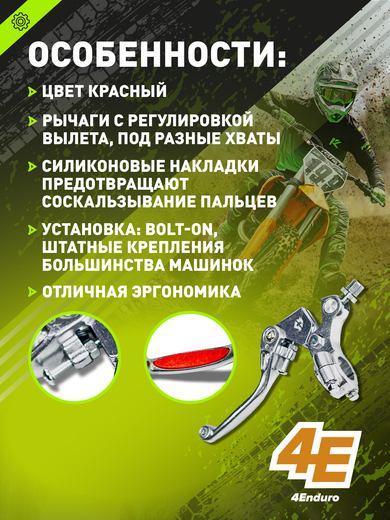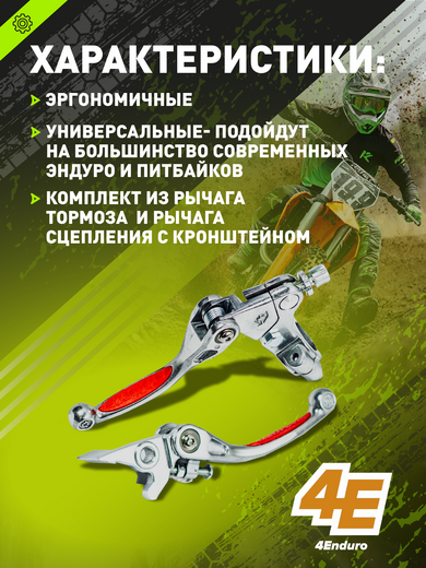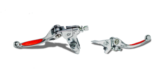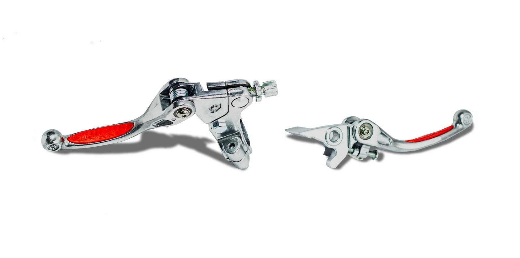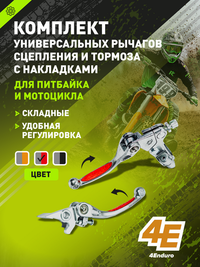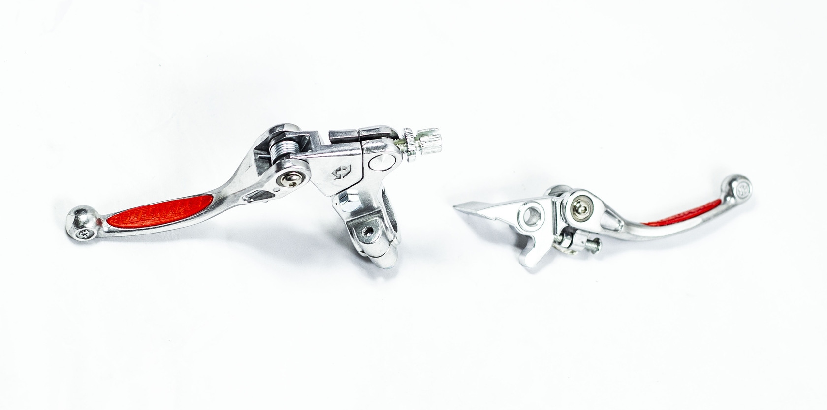 • Комплект складных универсальных рычагов: тормоз и сцепление, с силиконовыми накладками в местах контакта с пальцами райдера. Силикон обеспечивает дополнительный комфорт и надежный хват при любом хвате и в любых погодных условиях.