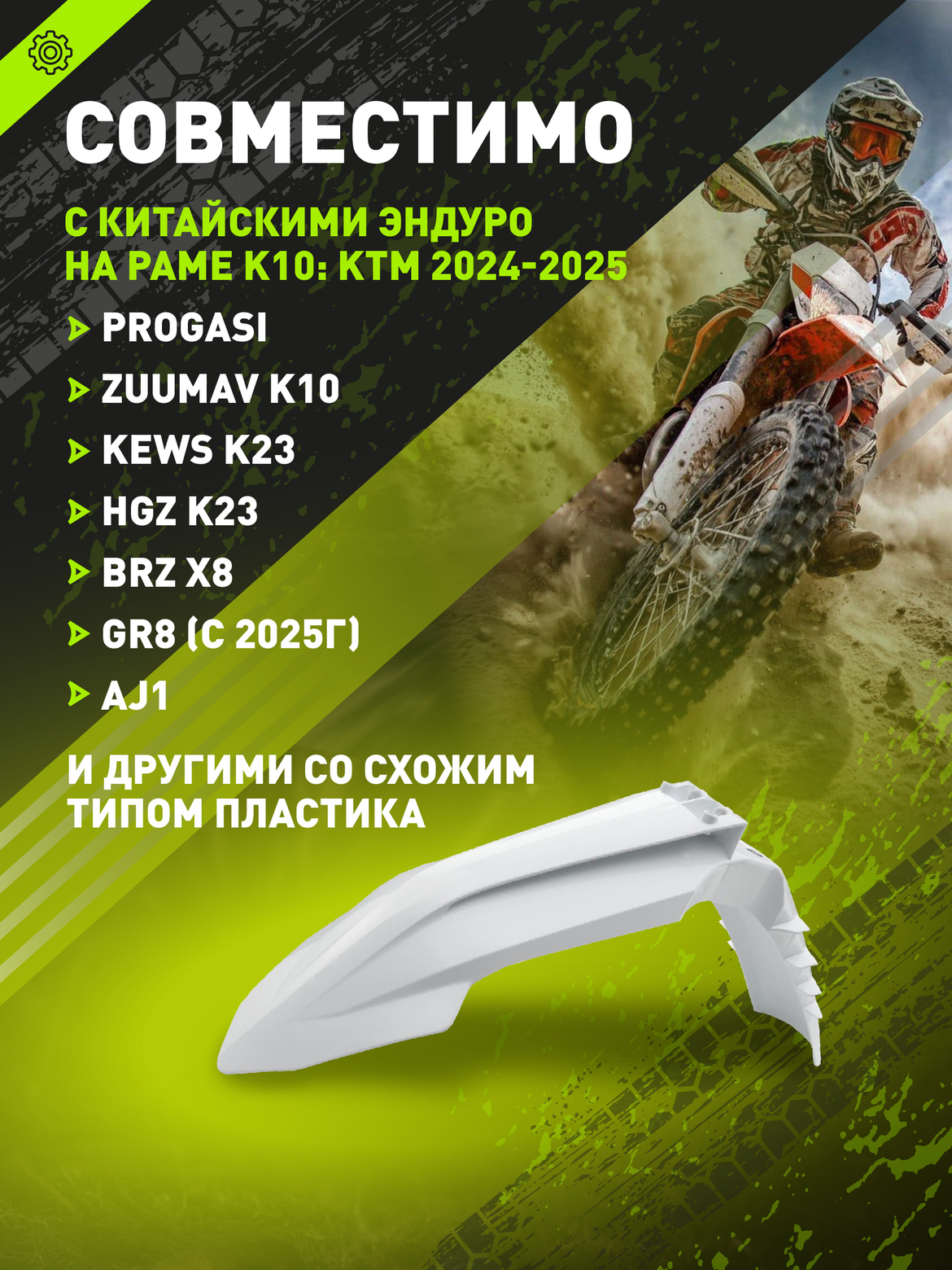• Переднее крыло для эндуро мотоциклов на базе KTM 2024 (A46008010000) года и китайских аналогов с рамой K10. Изготовлено из высококачественного пластика, полностью повторяет тип пластика KTM 24г. Обеспечивает надежную защиту от грязи и камней, сохраняя чистоту и внешний вид мотоцикла. Легко устанавливается на штатные крепления без доработок.