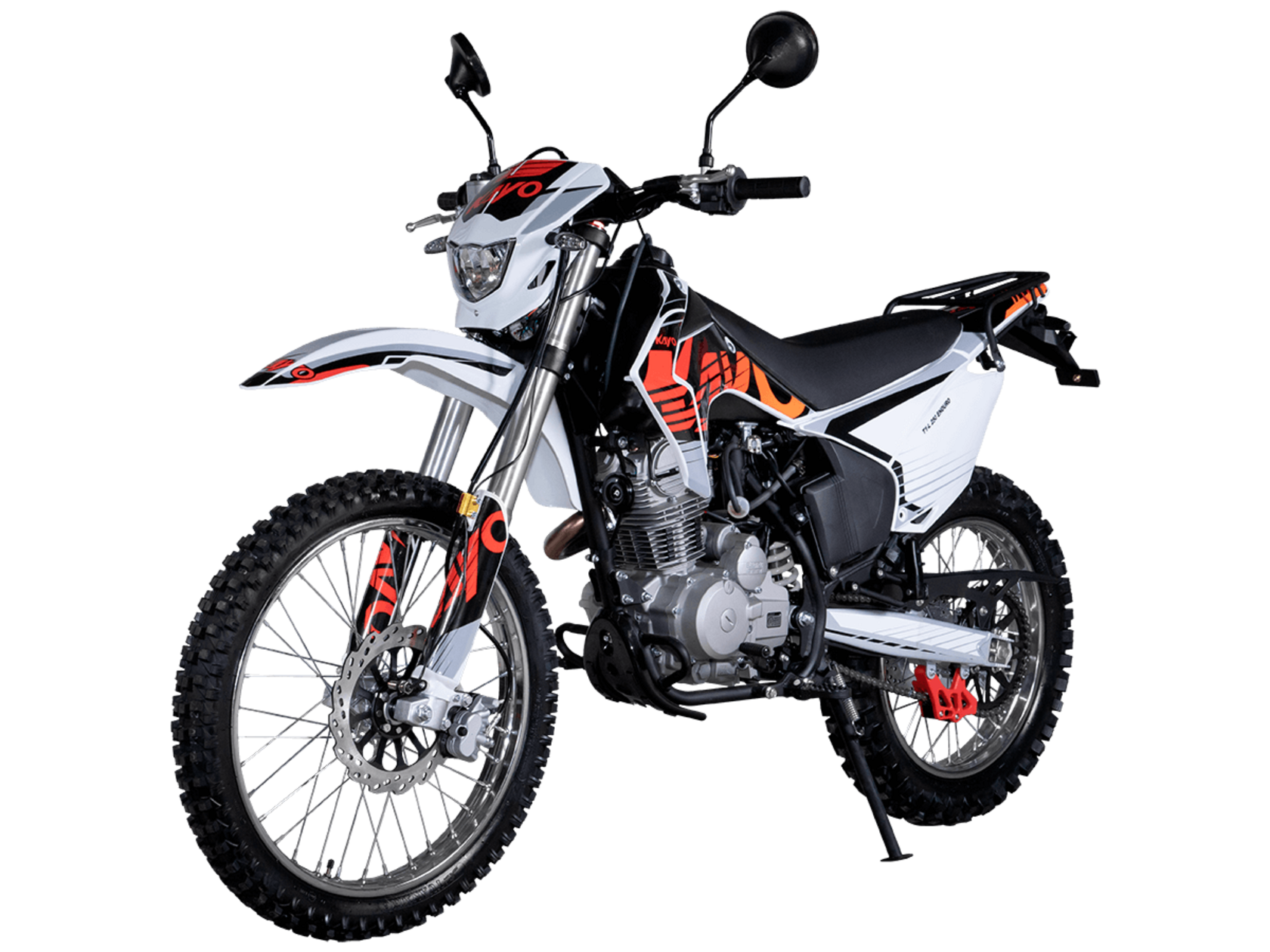 Мотоцикл KAYO T1-L 250 Enduro 21/18 2025 ПТС – облегчённая модель надёжного и производительного эндуро, уже готовая к покорению внедорожных трасс.Оснащён 4-тактным двигателем объёмом 223 см³ с верхним распредвалом и воздушным типом охлаждения. Способен развивать мощность в 16,32 л.с. при 8500 об/мин, а максимальный крутящий момент 17,5 Нм достигается при 6500 об/мин. За подачу топлива отвечает карбюратор PE30. Он обеспечивает топливную экономность и бесперебойную работу двигателя даже в самых жёстких условиях. Соотношение диаметра цилиндра и хода поршня 65,5x62,2. Степень сжатия 9,6:1. Запуск двигателя осуществляется с помощью электростартера или кикстартера. Тип зажигания CDI. Снизу установлена пластиковая защита двигателя.Механическая коробка передач имеет 5 ступеней. Привод цепной. Объём топливного бака 9 литров.На мотоцикл установлены спицованные колёса с алюминиевыми ободами и ступицами. Обуты во внедорожные покрышки YUANXING 80/100-21 и 110/100-18.Длина подвески спереди 830 мм, длина задней подвески 370 мм. Задняя подвеска оснащена прогрессией. Траверсы выполнены из литого алюминия, а прогрессия – из стали. За торможение отвечают дисковые гидравлические тормоза.Прочная рама и маятник выполнены из стали. Мотоцикл имеет ПТС и оснащён всем необходимым для поездок по дорогам общего пользования: галогеновая фара, диодные поворотники, диодный стоп-сигнал, звуковой сигнал, цифровая приборная панель, зеркала заднего вида.Для управления установлен руль переменного сечения 28 мм Fatbar со стандартными рычагами сцепления и тормоза. Имеется платформа для перевозки грузов и дополнительные подножки для поездок с пассажиром.Габариты мотоцикла 2100х810х1180 мм, вес 115 кг. Клиренс 300 мм, колёсная база 1400 мм, высота по седлу 890 мм.