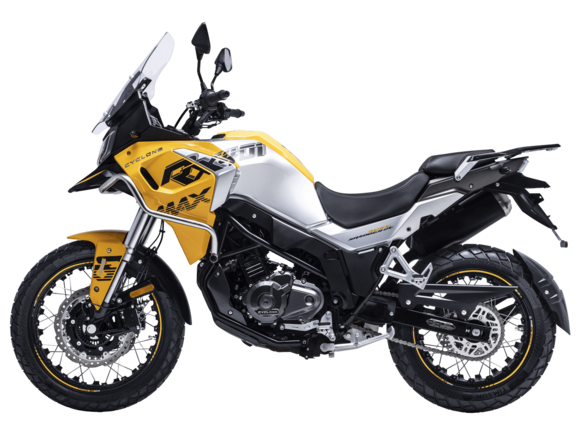 Мотоцикл CYCLONE RX401 (SR400GY-2D) – туристический эндуро, готовый бросить вызов любым дорогам и расстояниям. За рулём этого мотоцикла для вас не будет невозможных маршрутов. Его агрессивный дизайн всецело соответствует традициям жанра данного класса мототехники.Рядный двухцилиндровый четырёхтактный двигатель объёмом 401 см3 выдаёт 43 л.с. на 9500 об/мин. Максимальный крутящий момент достигается на 8000 об/мин и составляет 37 Н·м. Инжекторный впрыск топлива с блоком управления BOSCH увеличивает топливную экономичность, а также позволяет добиться высокой приёмистости и неприхотливости агрегата. Жидкостная система охлаждения не допустит перегрева двигателя даже при самом агрессивном вождении. На мотоцикл 6-ступенчатая механическая коробка передач.Максимальная скорость мотоцикла составляет 139 км/ч.RX401 оснащён спицованными алюминиевыми колёсами диаметром 17 и 19 дюймов. Колёса обуты в бескамерные покрышки от фирмы CST. С неровностями дороги эффективно справляются телескопическая вилка перевёрнутого типа спереди и маятник с моноамортизатором сзади. Ход передней подвески составляет 130 мм, задней – 55 мм. Оба компонента подвески являются регулируемыми. Эффективное и безопасное замедление с любых скоростей обеспечивают гидравлические дисковые тормоза с двухканальной системой ABS спереди и сзади.Клиренс мотоцикла составляет 185 мм. Объём топливного бака – 20 л. Снаряжённая масса – 215 кг.Мотоцикл отличает хорошо продуманная компоновка с высоко расположенным радиатором. На данной модели штатно установлены дуги безопасности, защита картера и двигателя, а также багажник с креплениями для боковых кофров. Кроме того, мотоцикл снабжён центральной подножкой для лёгкого обслуживания цепи, колес и вилки.Бортовой компьютер оборудован цветным дисплеем привлекательного дизайна со специальным защитным козырьком, спасающим от брызг и бликов. Из других приятных мелочей в допоборудовании мотоцикла стоит выделить 12-вольтовую розетку, подсветку пультов и USB-порт.Мотоцикл сочетает в себе отличные технические характеристики, комфорт и надёжность, что позволяет вам ощутить настоящую свободу на любой дороге с любым покрытием.