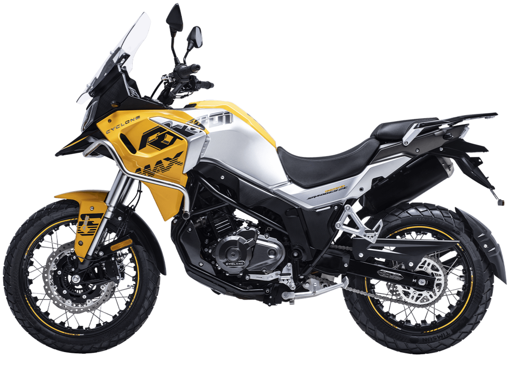 Мотоцикл CYCLONE RX401 2025 – туристический эндуро, готовый бросить вызов любым дорогам и расстояниям. За его рулём для вас не будет невозможных маршрутов!Оснащён рядным 2-цилиндровым 4-тактным двигателем DOHC объёмом 401 см³ с 4 клапанами на каждом цилиндре. Двигатель способен обеспечить мощность в 42,8 л.с. при 9500 об/мин, а максимальный крутящий момент 37 Н·м достигается на 8000 об/мин. Соотношение диаметра цилиндра и хода поршня 68х55,2 мм. Степень сжатия 11,6:1.Жидкостная система охлаждения не допустит перегрева двигателя даже при самом агрессивном вождении. Механическая коробка передач имеет 6 ступеней со схемой 1-N-2-3-4-5-6. Объём топливного бака 20 литров.Максимальная скорость мотоцикла 139 км/ч.Мотоцикл оснащён спицованными алюминиевыми колёсами диаметром 19 дюймов спереди и 17 сзади. Колёса обуты в бескамерные покрышки CST. В качестве передней подвески используется телескопическая вилка перевёрнутого типа, а сзади установлен маятник с моноамортизатором. Ход передней подвески 130 мм, задней – 55 мм. Оба компонента подвески регулируются. Для эффективного торможения используются гидравлические дисковые тормоза с 2-канальной ABS системой. Тормоза спереди представлены 2 тормозными дисками диаметром 305 мм с 4-поршневыми саппортами, а сзади расположен тормозной диск 258 мм с однопоршневым суппортом с плавающей скобой.Мотоцикл имеет продуманную конструкцию с высоко расположенным радиатором.Для освещения и сигнальных огней используется диодная светотехника. Данные от бортового компьютера выводятся на яркий цветной дисплей, оснащённый специальным козырьком для защиты от брызг и бликов. Имеются подсветка пультов, USB-порт, 12-вольтная розетка.Габариты 2160x860x1395 мм, снаряжённая масса 215 кг. Колёсная база 1410 мм, клиренс 185 мм, высота по седлу 810 мм.