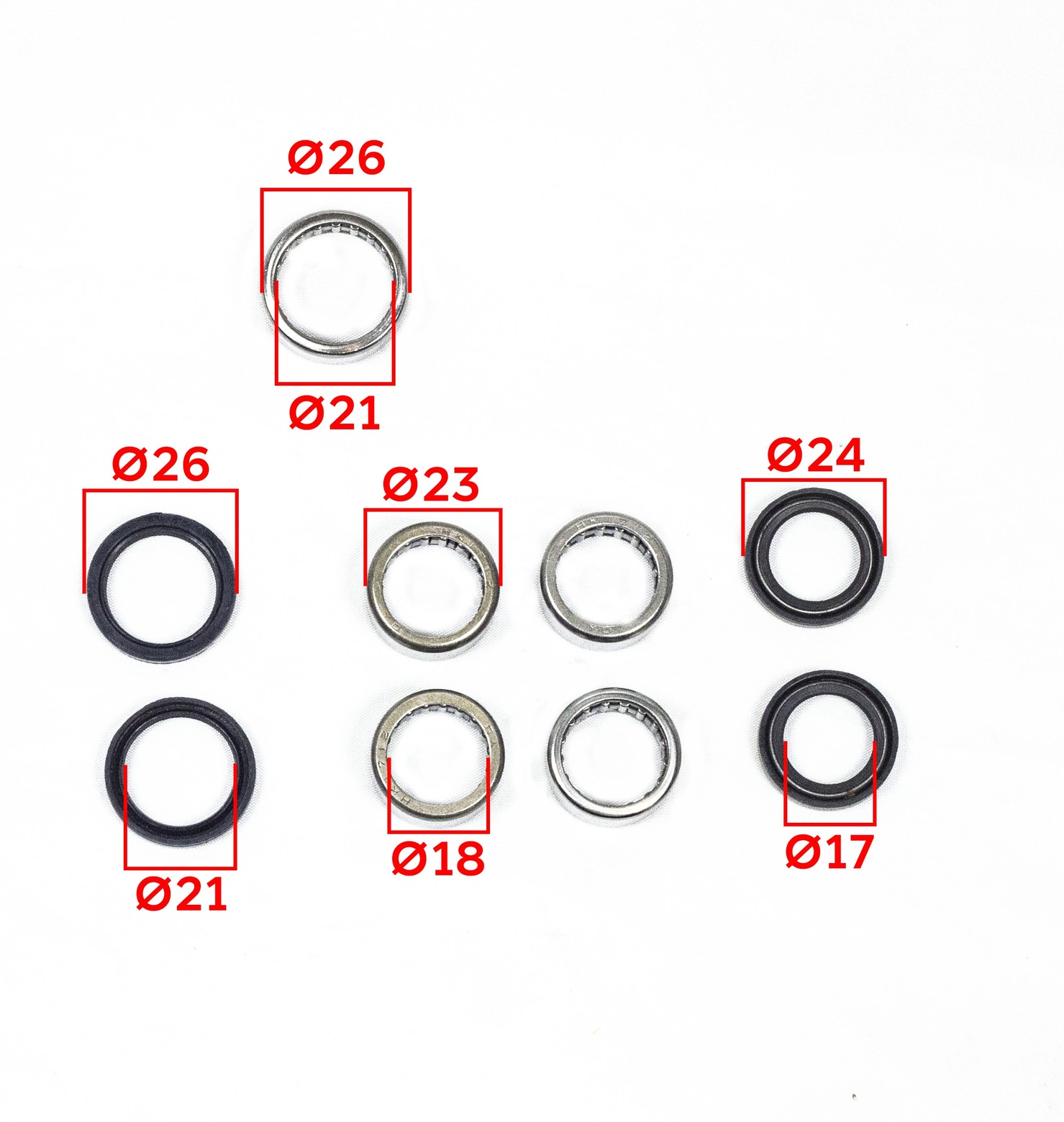 • Сальники / Пыльники (8 шт):Размер 17х24х5 мм — 6 шт.Размер 20х26х5 мм — 2 шт.