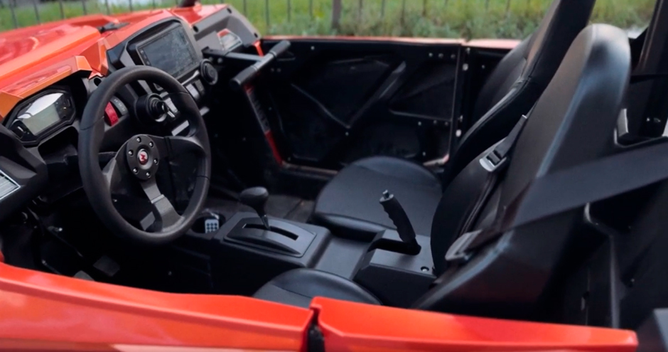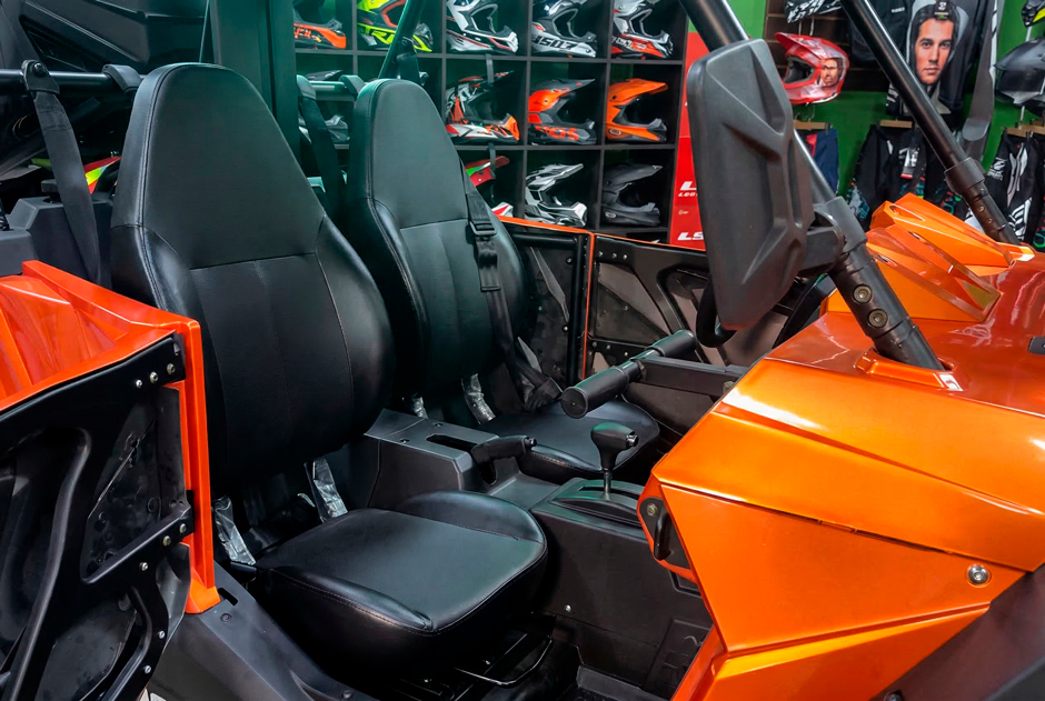 Двухместный салон продуман до мелочей. Удобная посадка, достаточное пространство для ног и продуманная эргономика позволяют чувствовать себя комфортно даже на длинных маршрутах. Приборная панель информативна: тахометр, датчики топлива и температуры, индикаторы передачи и привода — вся необходимая информация под рукой. 12-вольтовая розетка позволяет подключать гаджеты, навигатор или портативный холодильник.