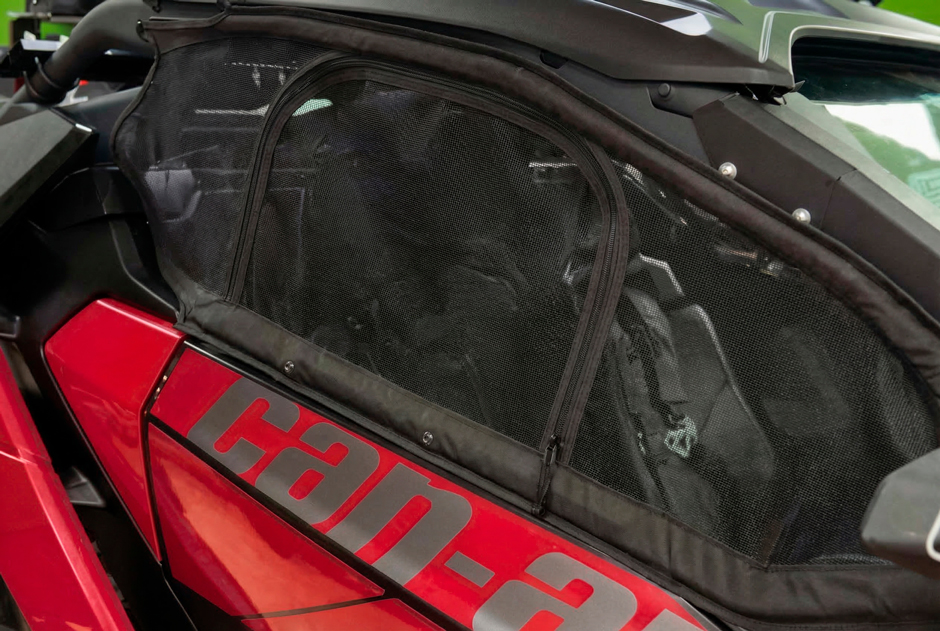 Если смотреть строго по профилю, багги BRP Maverick поражает лаконичностью и продуманностью. Сбоку виден усиленный порог, по-настоящему толстый и выносливый, чтобы защищать экипаж в самых сложных условиях эксплуатации. Двери оснащены не просто сетками, а фирменными окнами с молниями: летом можно проветрить салон или перекинуть что-нибудь наружу, а грязь останется вне кузова.