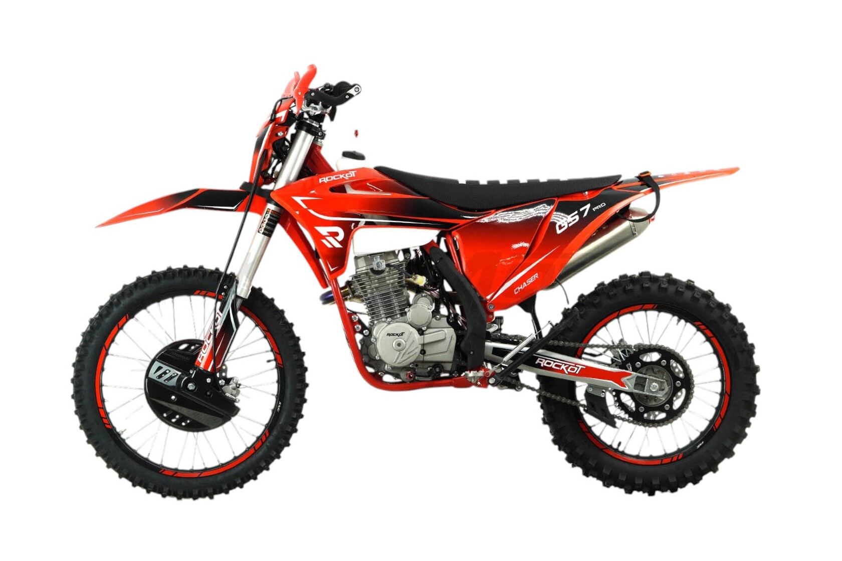 ROCKOT GS7 PRO Chaser - новинка в линейке мотоциклов GS от компании ROCKOT. Этот мотоцикл позиционируется как среднеразмерный эндуро высшего сегмента, о чем говорит его богатая комплектация. На сегодняшний день, это первый среднеразмерный эндуро, построенный на раме типа S6 в паре с современным и мощным двигателем LONCIN YB300H LX176FMN, а также более производительной подвеской, в сравнении с другими среднеразмерниками, и алюминиевыми дисками фирмы KKE.Исходя из названия модели - “Chaser”, что переводится как - охотник/преследователь, мы можем сказать, что его имя полностью оправдано дизайном, в котором выполнен данный мотоцикл. Здесь преобладает сочетание красного и черного цветов, что в графике плавно переходят в виде градиента. Рама мотоцикла окрашена в яркий красный цвет, а колесные диски в насыщенный черный, что делает образ мотоцикла ярким и контрастным. Элементы подвески и двигатель - серебристого цвета. Это позволило сделать мотоцикл более легким в его визуальном восприятии. Из множества других мотоциклов этого класса его выделяет облицовочный пластик, корни которого ведут к среднеразмерным кроссовым мотоциклам GASGAS. Фара головного света позаимствована от мотоциклов в стилистике KTM. Также стоит отметить множество элементов тюнинга, которые вписываются в концепцию и дизайн мотоцикла - “охотника” за наградами и призовыми местами в различных эндуро гонках.ROCKOT GS7 PRO Chaser оснащен самым современным двигателем Loncin YB300H LX176FMN мощностью 24,5 лошадиные силы и 18 Nm крутящего момента, который распределен “ровной полкой” от низкого до высокого диапазона оборотов коленвала. Диаметр цилиндра составляет 76 мм, а ход поршня - 63 мм. Двигатель отлично работает на топливе АИ-92/АИ-95 благодаря низкой степени сжатия - 9:1. Данный двигатель имеет четырехклапанную систему газораспределения и один распредвал, чем и достигается такая высокая мощность в паре с плоскодроссельным карбюратором PWK34. Выхлопная система выполнена из нержавеющей стали. Для повышения крутящего момента на низких оборотах, в приемную трубу встроен резонатор “PowerBomb”, имеющий обновленную форму. Пятиступенчатая коробка передач имеет специально подобранное для эндуро передаточное соотношение и корзину сцепления с семью дисками увеличенного размера. Все это говорит о прямом назначении данного двигателя для эндуро. Немаловажной частью в конструкции двигателя является балансирный вал, который гасит вибрации двигателя и делает тренировки на мотоцикле максимально комфортными. Также двигатель обладает системой фильтрации моторного масла со сменным масляным фильтром.ROCKOT GS7 PRO Chaser построен на раме S6, в основе которой лежит профессиональная рама S8 полноразмерных эндуро мотоциклов GS серии. Несущая часть рамы, расположенная в передней верхней части, имеет увеличенное сечение, как и сам корпус рулевой колонки, что увеличивает диапазон применения различных амортизаторов вплоть до 940/48. Передняя нижняя часть рамы выполнена в виде двух труб восьмигранного сечения. Данное конструкторское решение сделало раму более легкой, но при этом очень прочной. Боковая часть рамы состоит из плоских труб с шестигранным сечением. Геометрия рамы разрабатывалась специально для езды в дисциплине эндуро и по сей день оправдывает свое предназначение.Спереди установлена телескопическая вилка перевернутого типа с увеличен
